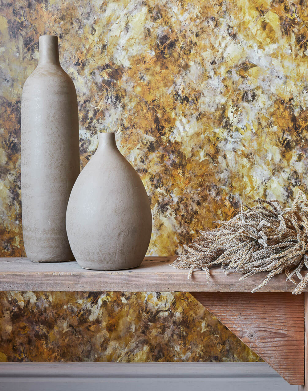 17 Patterns’ Demiurge Wallpaper morphs traditional painting with digital artistry into an abstract crescendo of complex textures and enriched tones. Working in collaboration, British contemporary artists – Paris & Nosca Inc repeatedly convolute pre existing matter to craft a formless composition of painterly gestural marks. Each multiple layer of golden glowing hues delivers a soulful montage of harmonious color and uplifting energy. Developed to coordinate perfectly within both period and modern interiors, Demiurge pulls art out of the picture frame onto an alluring contemporary wallcovering.