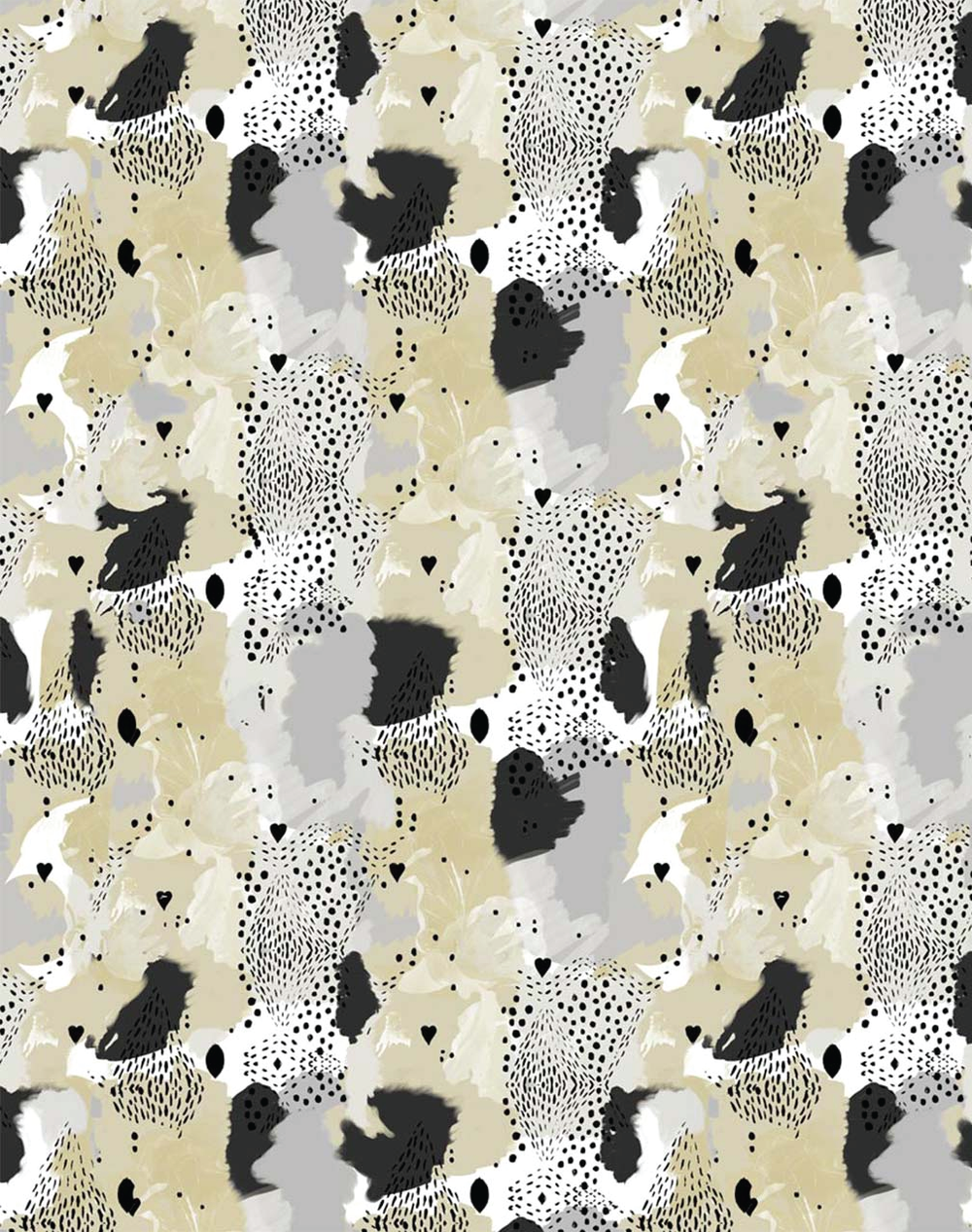 Athens-born illustrator, artist and textile designer, Christina K, presents a beautiful exploration into the wild for her 17 Patterns debut collection, Love Leopard. Using traditional and digital mark-making techniques, this alluring composition of love hearts, spot formations and peppered textured camouflage, captures the signature romance of Christina’s illustrative works. With its contrasting, delicate soft tones and darker motifs, this collection introduces a relaxing and subdued mood with a perfect blend of glamour and style. Love Leopard is delivered across four pastel palettes of lemon, caramel, peach and grey.