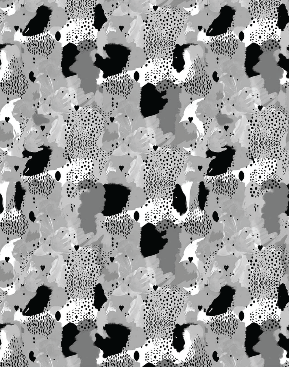 Athens-born illustrator, artist and textile designer, Christina K, presents a beautiful exploration into the wild for her 17 Patterns debut collection, Love Leopard. Using traditional and digital mark-making techniques, this alluring composition of love hearts, spot formations and peppered textured camouflage, captures the signature romance of Christina’s illustrative works. With its contrasting, delicate soft tones and darker motifs, this collection introduces a relaxing and subdued mood with a perfect blend of glamour and style. Love Leopard is delivered across four pastel palettes of lemon, caramel, peach and grey.