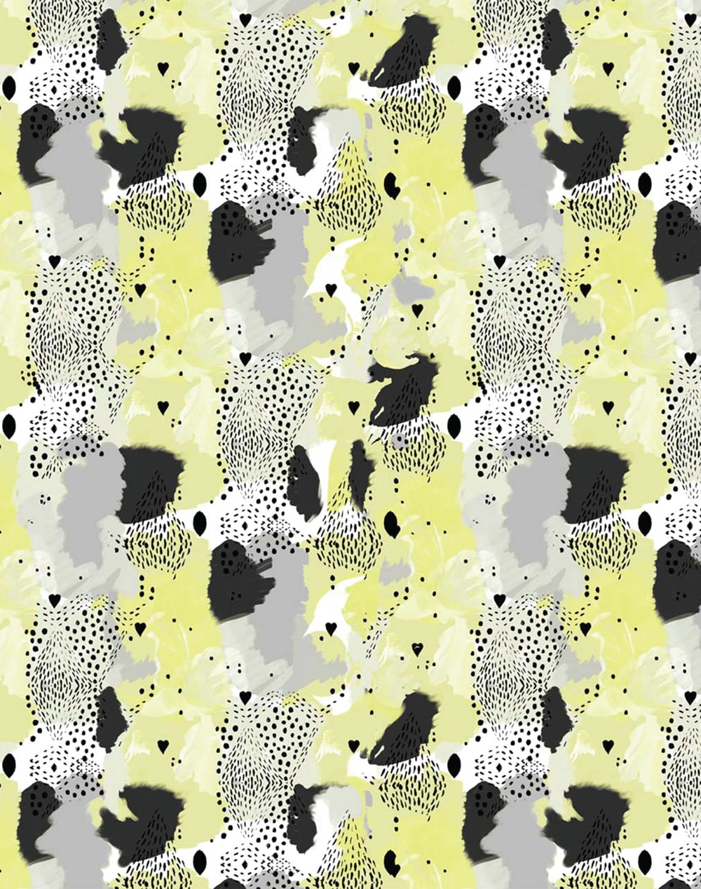 Athens-born illustrator, artist and textile designer, Christina K, presents a beautiful exploration into the wild for her 17 Patterns debut collection, Love Leopard. Using traditional and digital mark-making techniques, this alluring composition of love hearts, spot formations and peppered textured camouflage, captures the signature romance of Christina’s illustrative works. With its contrasting, delicate soft tones and darker motifs, this collection introduces a relaxing and subdued mood with a perfect blend of glamour and style. Love Leopard is delivered across four pastel palettes of lemon, caramel, peach and grey.
