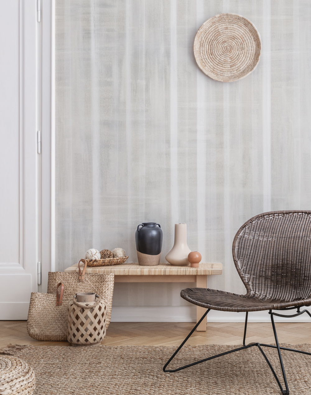 Like bands of light, painted brushstrokes are overlaid to create vertical streaks of light and dark. Nuance, subtlety and linear movement make this mural a versatile backdrop.