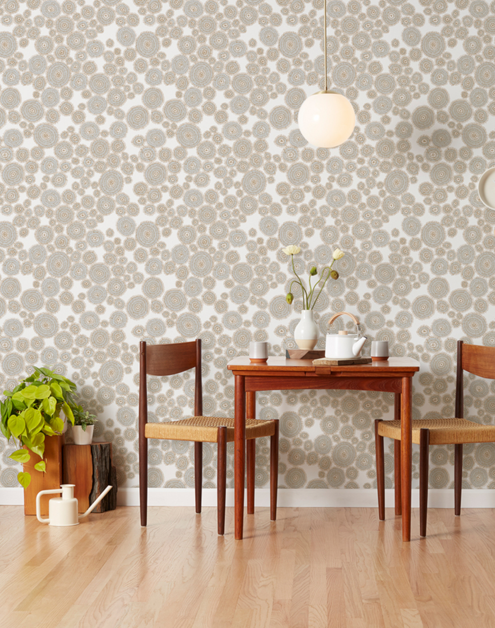 This five-color (including metallic gold) wallpaper is hand-screenprinted using water-based inks on recyclable paper. This paper is also available in two additional colorways. This pattern is designed to be a more subtle companion paper to our Succulent pattern.