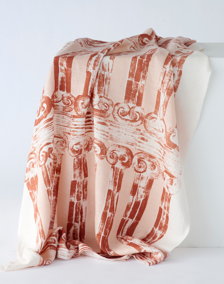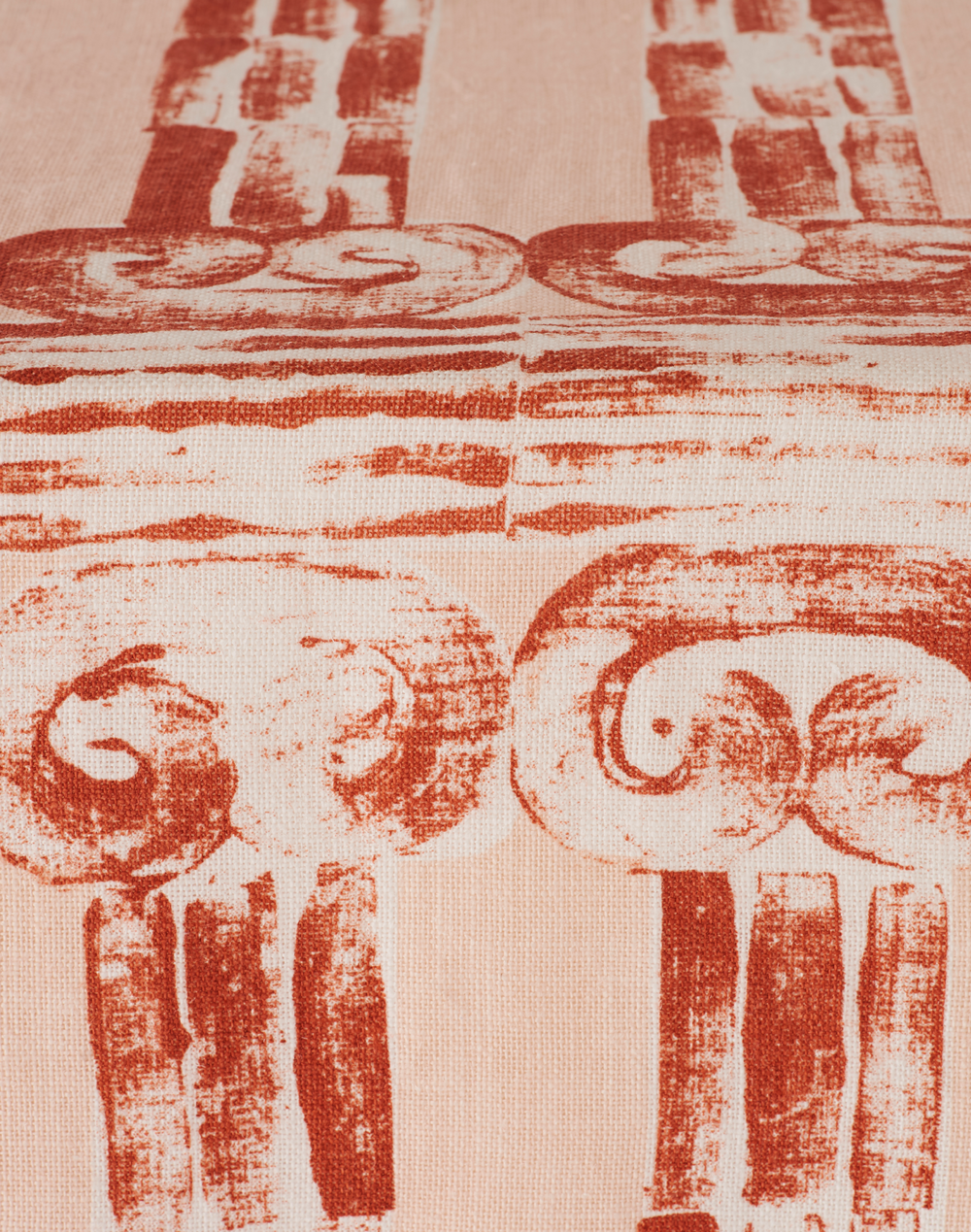 Hand screen printed with reactive dyes in our London Studio in two color layers. This design began life as a wood block print developed during our time on residency at Cove Park in Scotland.