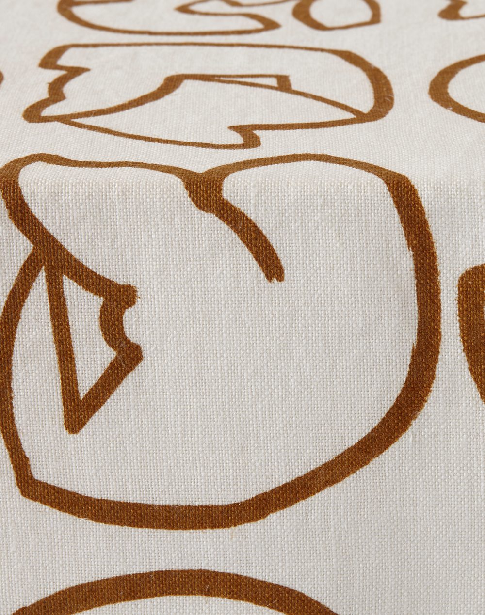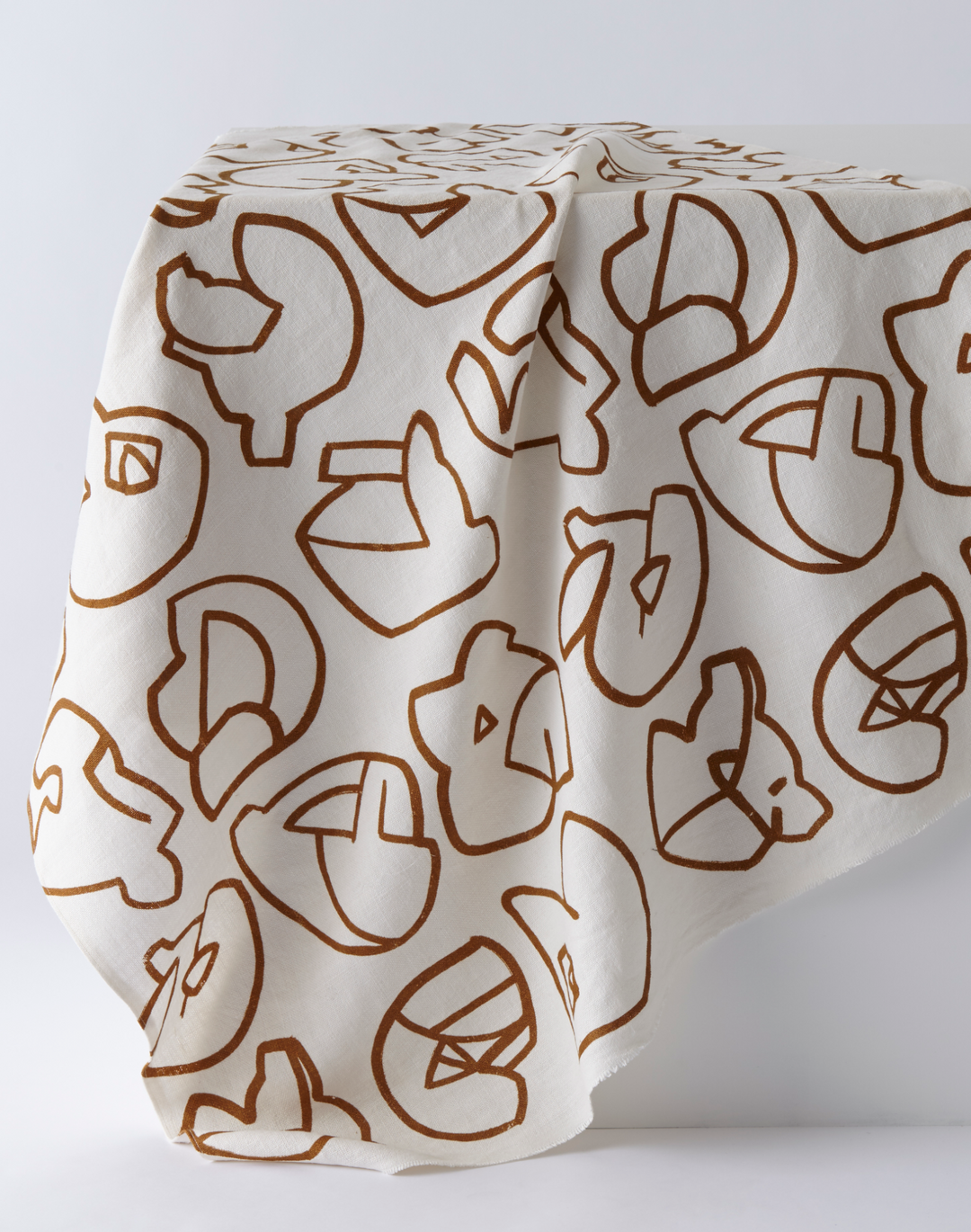 Hand dyed and printed with reactive dyes onto a textured linen. Perfect for curtaining, soft furnishing or domestic upholstery.