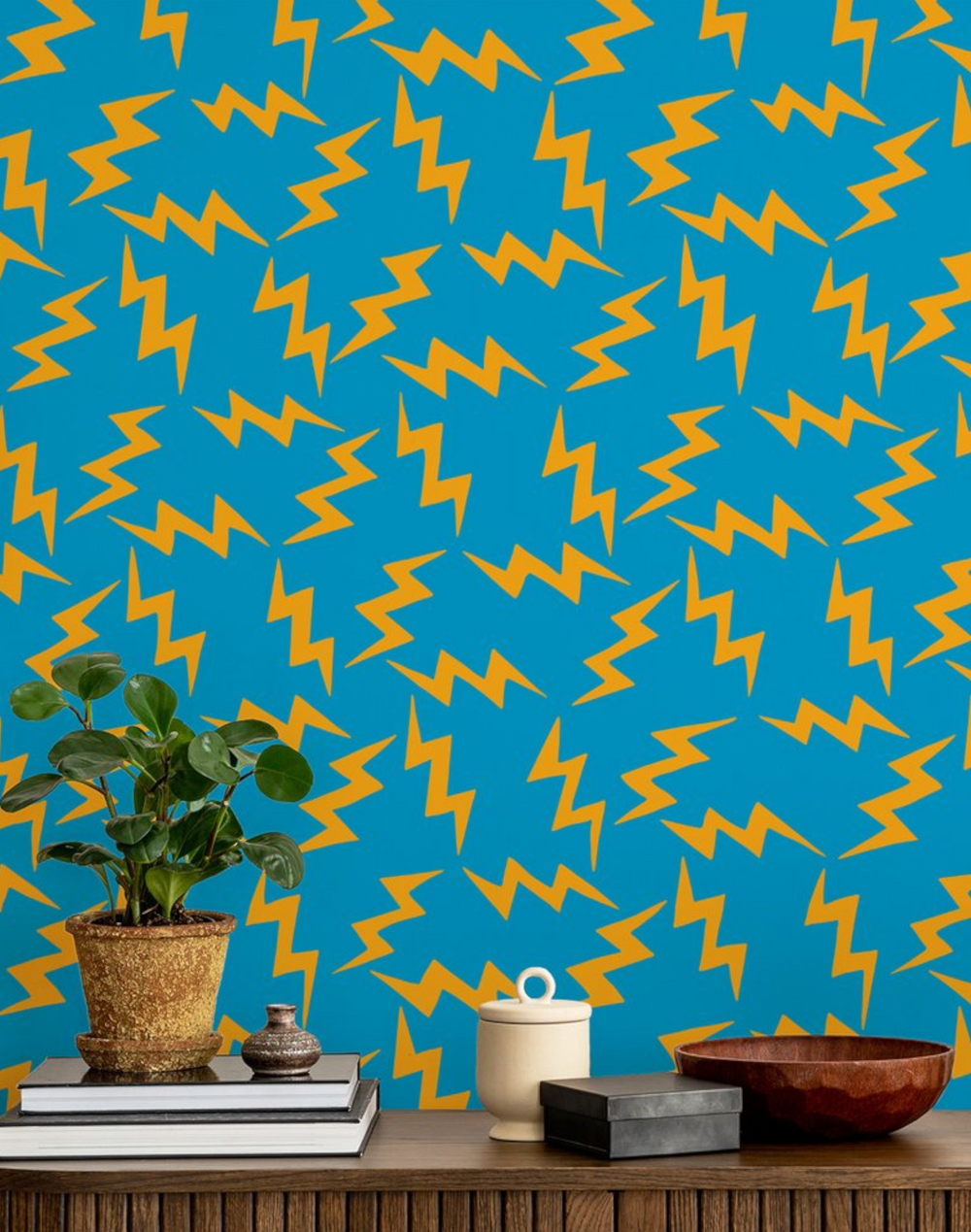 Designed together, Thunder and Lightning were born from Merenda’s drawing of dancing lightning bolts and playful hexagons. Thunder portrays a more classic geometric pattern, while Lightning features larger bolts in a true superhero style.
