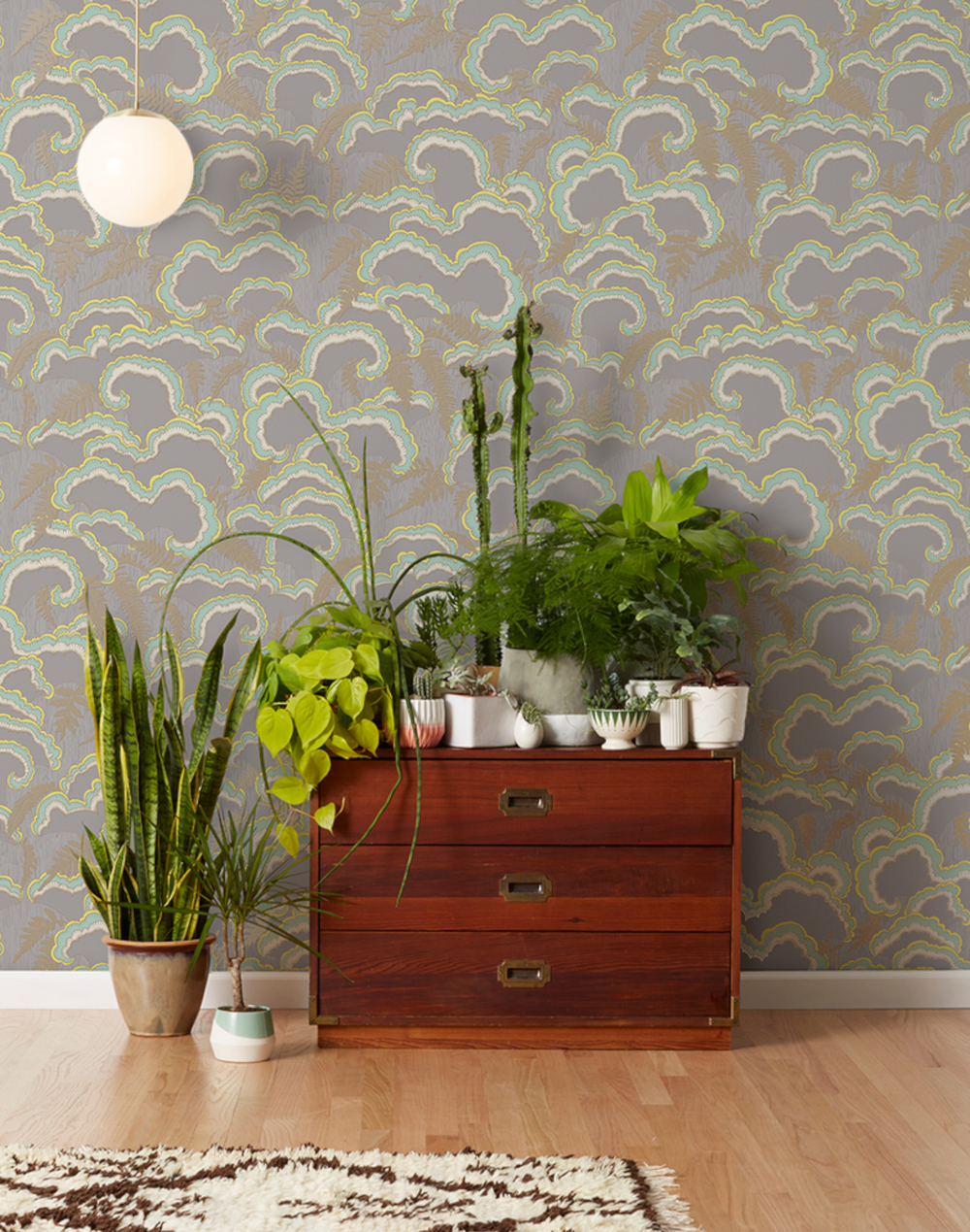 This five-color (including metallic gold) wallpaper is hand-screenprinted using water-based inks on recyclable paper.