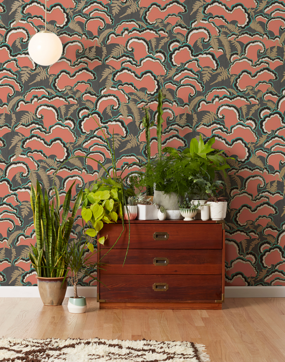 This five-color (including metallic gold) wallpaper is hand-screenprinted using water-based inks on recyclable paper.