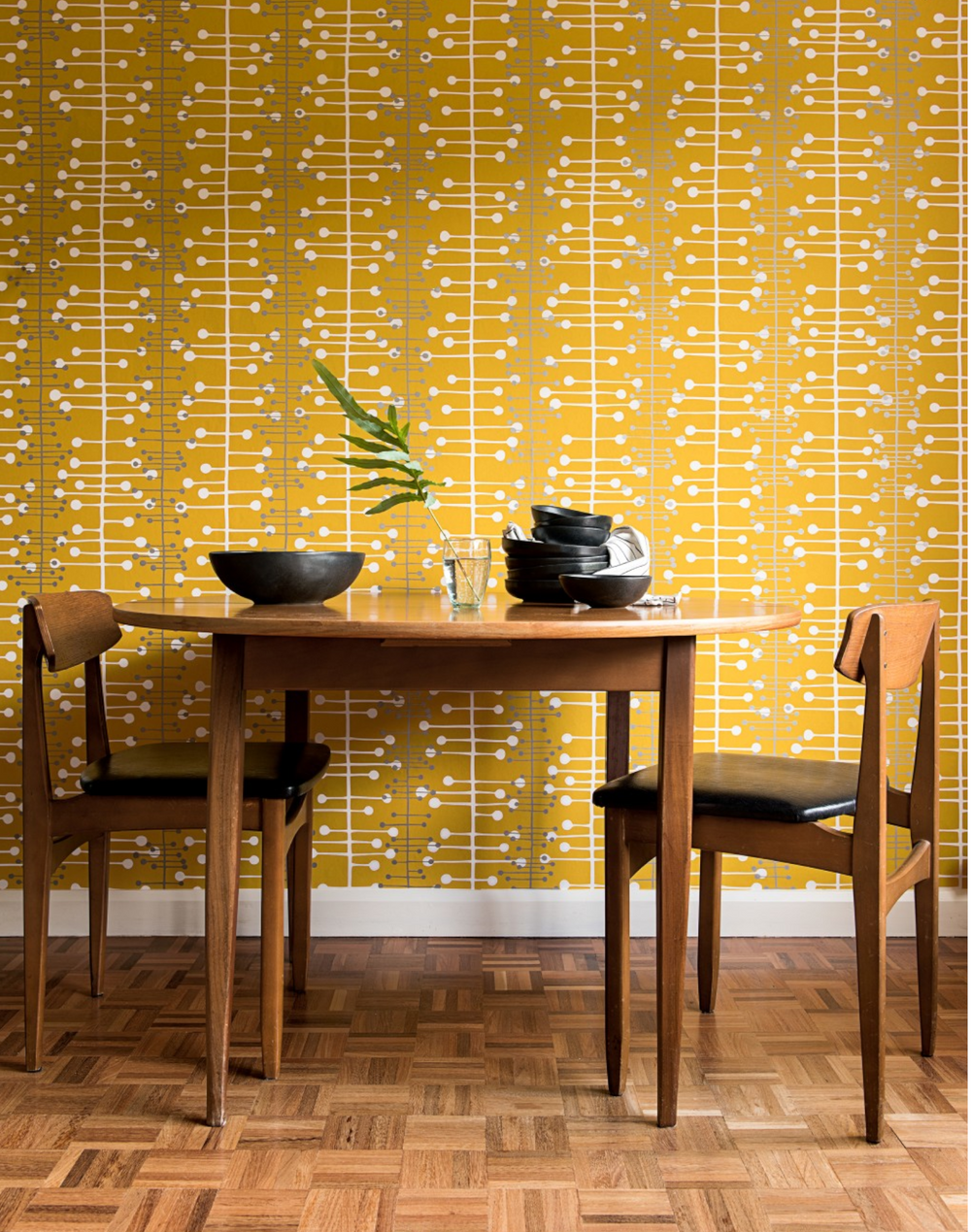 Originally inspired by mid-century science-based atomic design, abstract organic forms rise and grow from slim vertical stems. Featuring new colorways and the introduction of metallic accents for the Signature Collection, the Muscat design adds subtle texture to walls with a fresh color palette, adding new life to vintage forms.