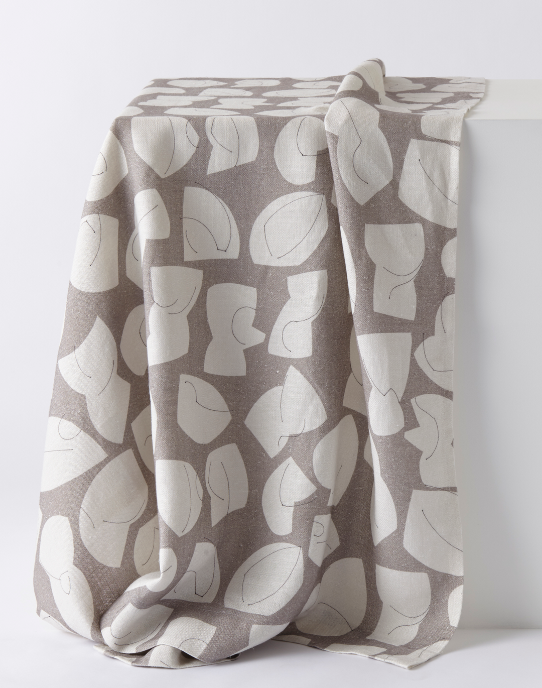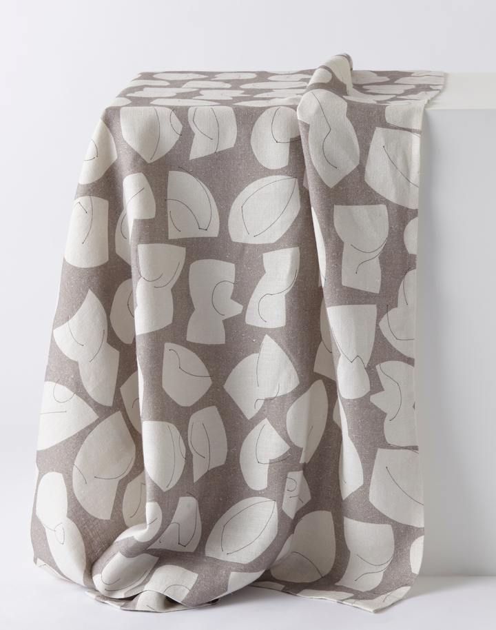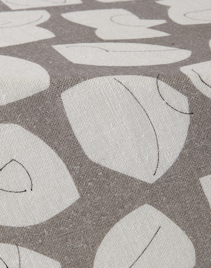 Printed with reactive dyes onto a textured heavyweight linen which softens with use. This print has a complementary off white silhouette and off black line detail. Because of the nature of the linen, the solid background color has a slightly textured appearance.