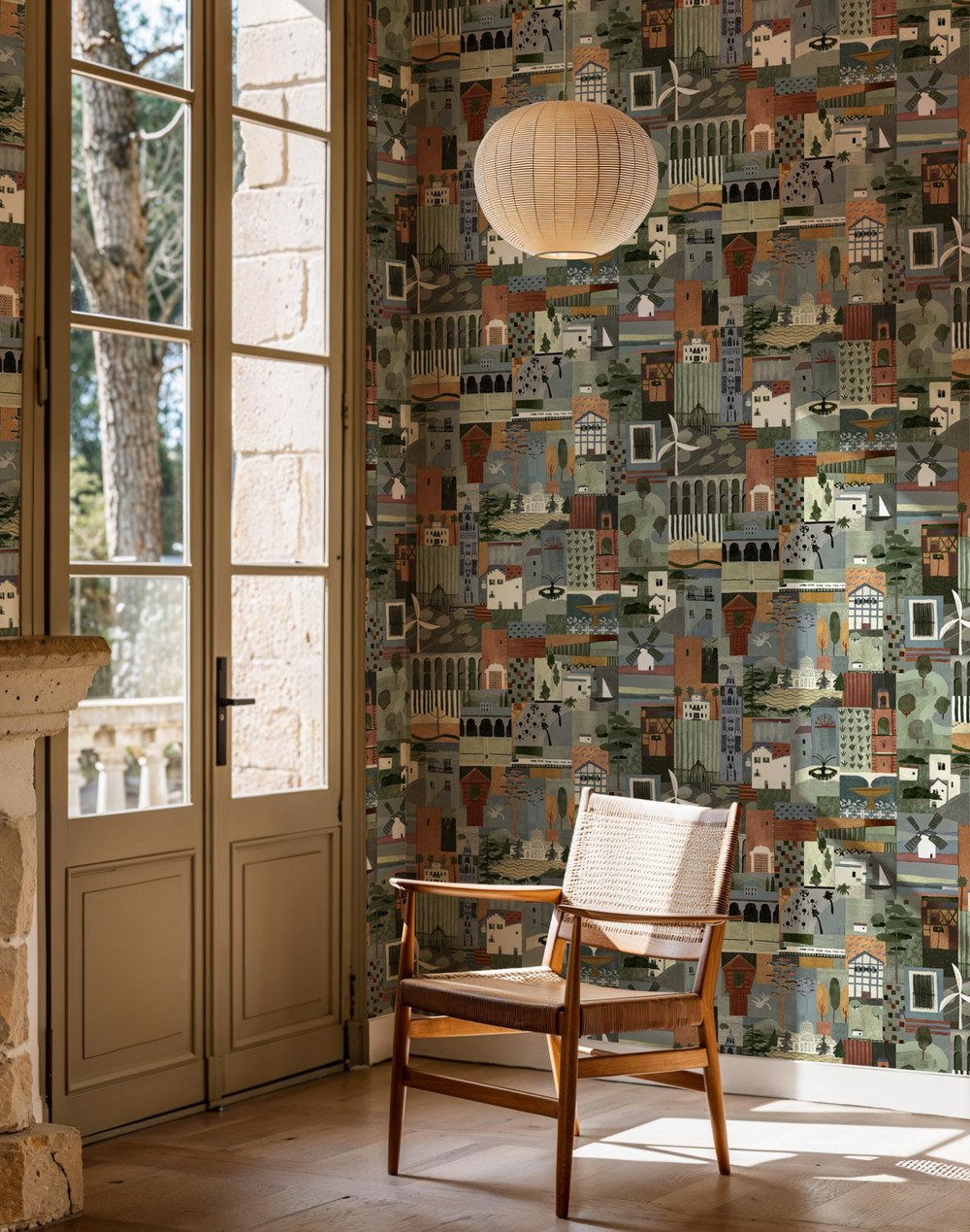 Tres Tintas’s Postal Blue is a Landscapes design in blue/navy from the Solera collection. A collage of images and iconic places where the appetite of tourists is awakened, attracted by the immense diversity of our beloved land. Dry fields, colorful orchards, the Mediterranean Sea and white houses, quixotic mills and the remnants of Al-Andalus.