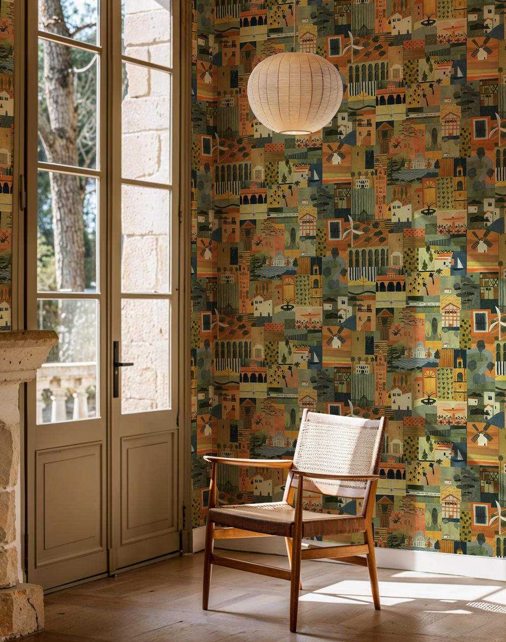 Tres Tintas’s Postal Green is a Landscapes design in green from the Solera collection. A collage of images and iconic places where the appetite of tourists is awakened, attracted by the immense diversity of our beloved land. Dry fields, colorful orchards, the Mediterranean Sea and white houses, quixotic mills and the remnants of Al-Andalus.