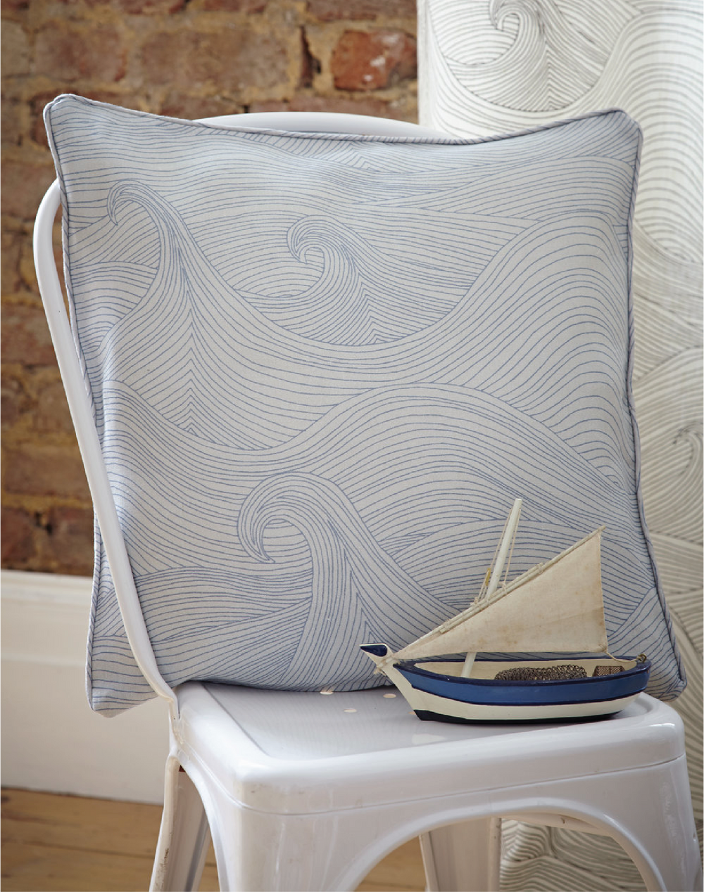 Seascape Winter is a black line drawing on white ground. The design is inspired by the rolling waves of a tempestuous sea designed to flow across your soft furnishings. Digitally printed in the UK on dew retted UK linen