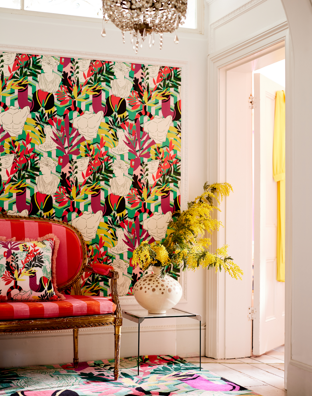 A celebration of contrast and contradiction, STATUARIO is the place where ancient meets modern and simplicity meets complexity. The stark white of the statues contrasts beautifully with the vibrant hues of the flowers, while the clean lines of the abstract shapes provide a striking backdrop for the intricate details of the design. The ancient figures evoke a sense of timeless grace and beauty, their sculpted forms standing as a testament to the enduring legacy of classical artistry, while the backdrop of abstract geometrical shapes blends classical elegance with modern flair. Create a sense of harmony and balance that is both captivating and serene, while adorning your space with STATUARIO or STATUARIO BLU, the pattern infused with a touch of elegant blue.