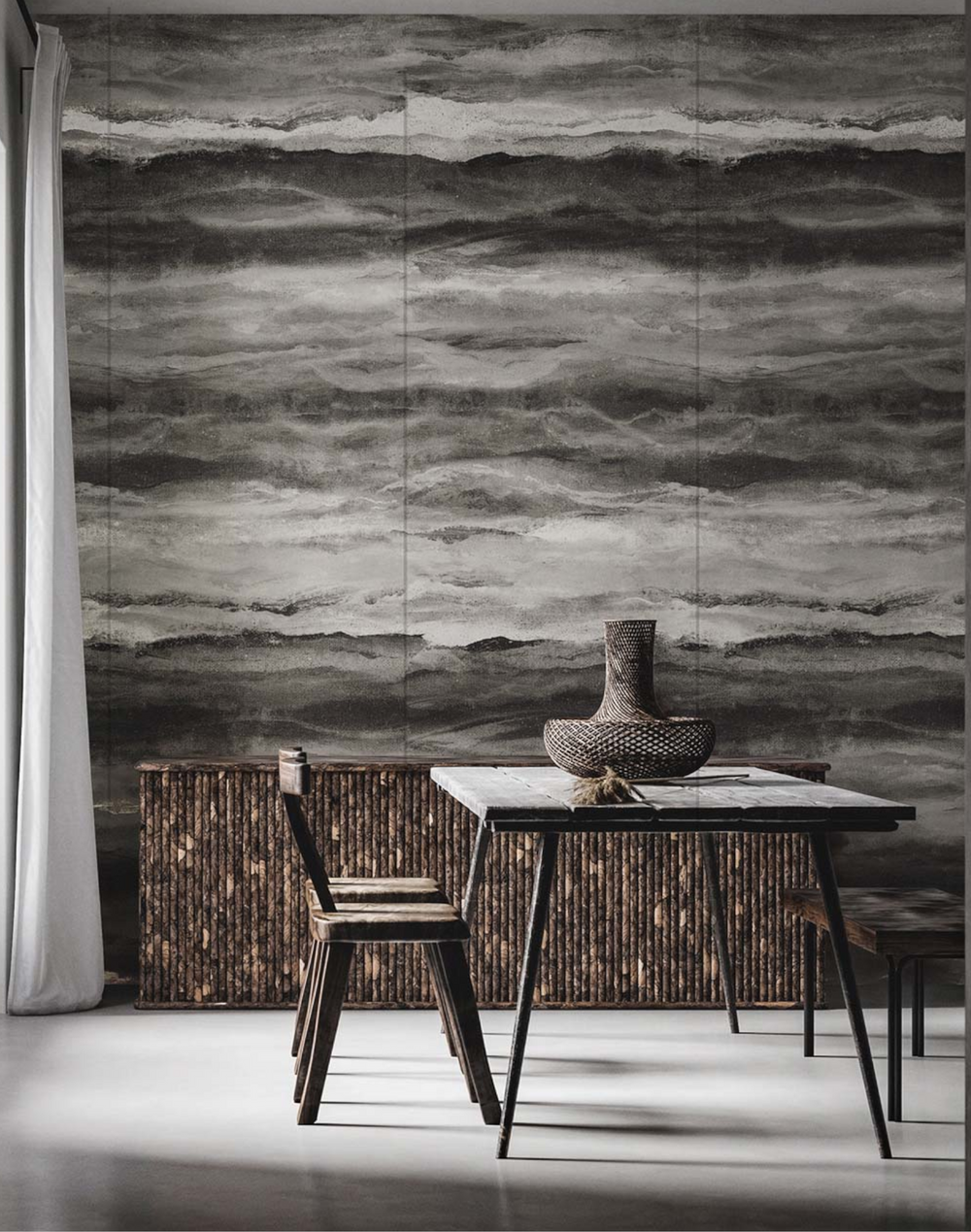 Stira’s Hand depicts a body of alluring mythical landscapes across a series of large-scale wallcoverings. Encompassing the three elements – Land, Sky, and Sea, these beautifully painted scenes furnish boundless imagination into any interior. Brought to life with impeccable British craftsmanship, Stira’s abstract brush strokes and subtle pigmentations are presented on our finest fibrous parchment, creating an authentic textured backdrop reminiscent of the artist’s canvas. Indulge your imagination across four vivid colorways, Stratum, Horizons, Changing Tides (+ Ombre Edition) and Nightfall (on Silver Mica).