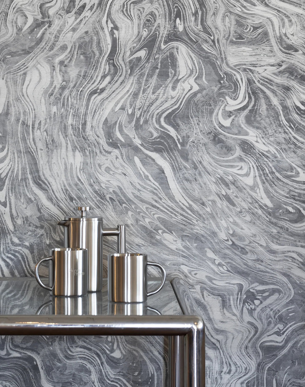 Terrain began with an original handmade marbled paper design further exaggerated into the sinuous pattern found in all instances of one force fighting its way through another: ink through water, a river through terrain, and so on.
