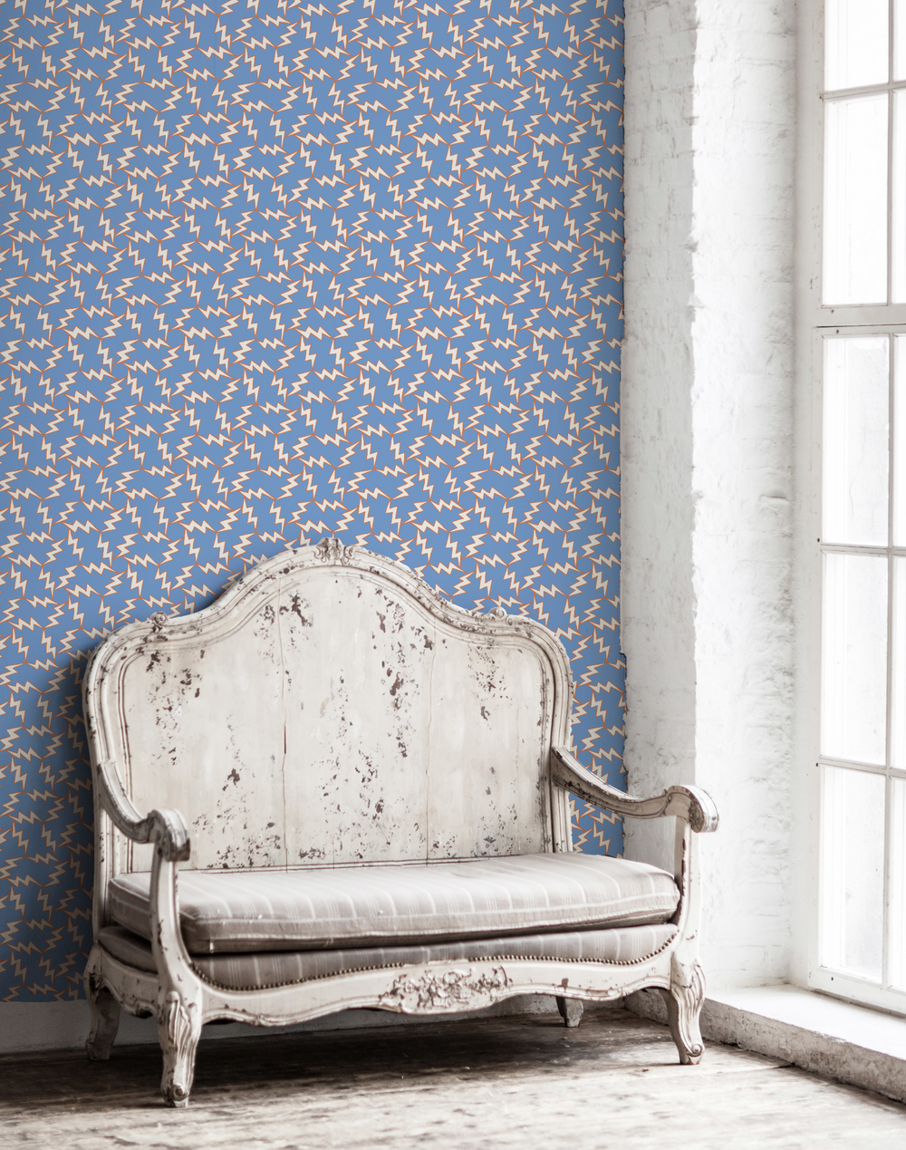 Designed together, Thunder and Lightning were born from Merenda’s drawing of dancing lightning bolts and playful hexagons. Thunder portrays a more classic geometric pattern, while Lightning features larger bolts in a true superhero style.