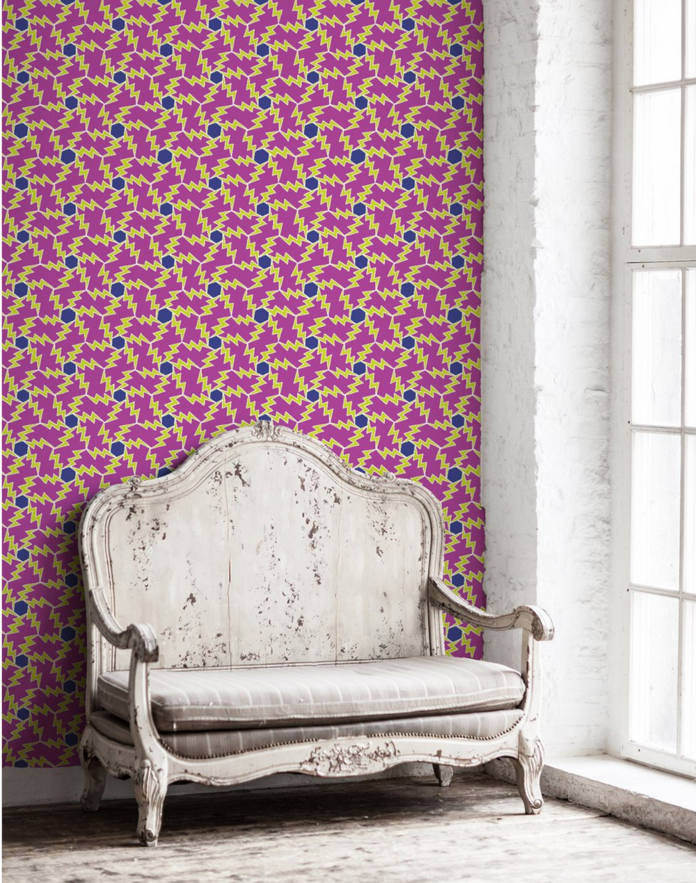 Designed together, Thunder and Lightning were born from Merenda’s drawing of dancing lightning bolts and playful hexagons. Thunder portrays a more classic geometric pattern, while Lightning features larger bolts in a true superhero style.