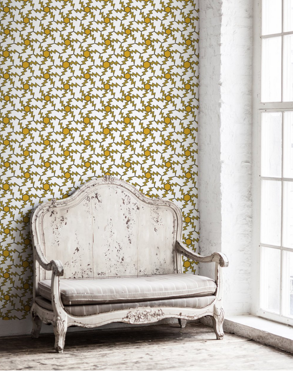 Designed together, Thunder and Lightning were born from Merenda’s drawing of dancing lightning bolts and playful hexagons. Thunder portrays a more classic geometric pattern, while Lightning features larger bolts in a true superhero style.