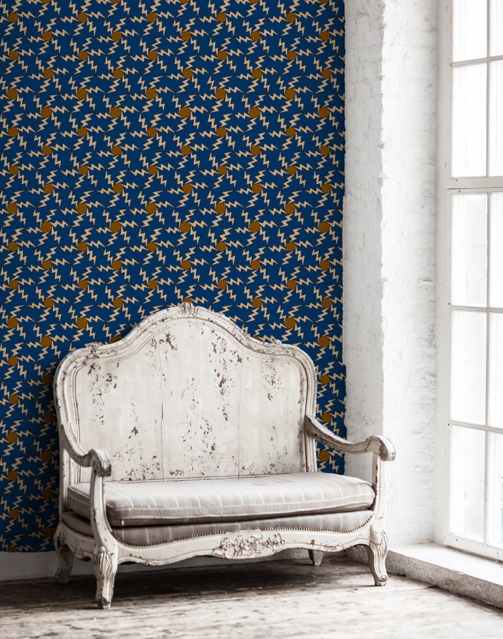 Designed together, Thunder and Lightning were born from Merenda’s drawing of dancing lightning bolts and playful hexagons. Thunder portrays a more classic geometric pattern, while Lightning features larger bolts in a true superhero style.