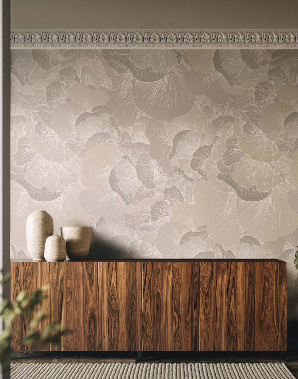Reminiscent of the regal grandiose of yesteryears, Venation’s intricate line work runs deep throughout an amass of beautifully illustrated leaves. Lavish and rich in color, this delicate botanical pattern impressively spans its dichotomous veins across two widths of textured wallpaper. Delivering intrigue and depth across a tonal montage of varying sized lamina, this magnificent mural comes in easy to install sequential panels that effortlessly transform both contemporary and traditional interiors. This future classic is available in seven stunning palettes, Natural, Dusty, Gold, Jewel, Orient, Royal, and Dark.
