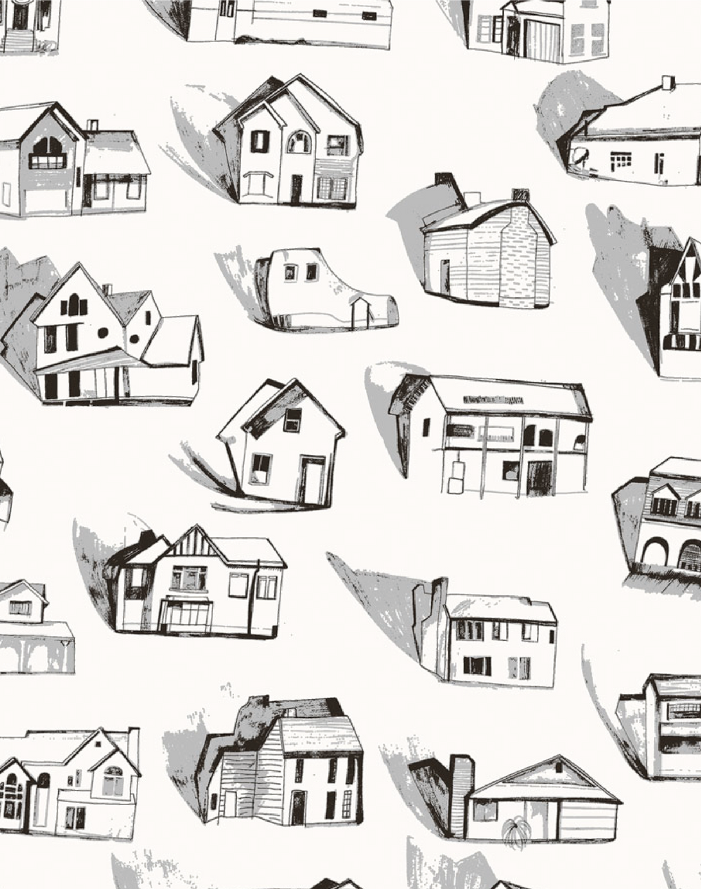 A playful hand-drawn design, illustrating architectural styles of the last century. Houses are softly sketched against a plain cream background to enhance the unique details of each building. Traditionally printed using environmentally friendly pigments, this distinctive wallcovering brings charm and character to any space.