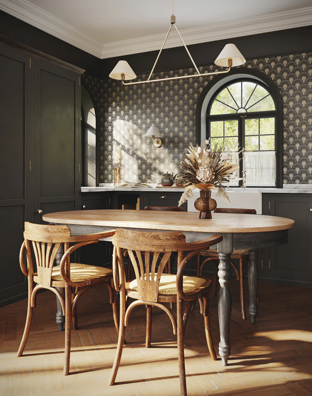An Art Deco wallpaper that brings Gatsby glamour to your home, with an exquisite color palette of smokey grey and shimmering gold - a perfect wallpaper to use in a kitchen or dining room.