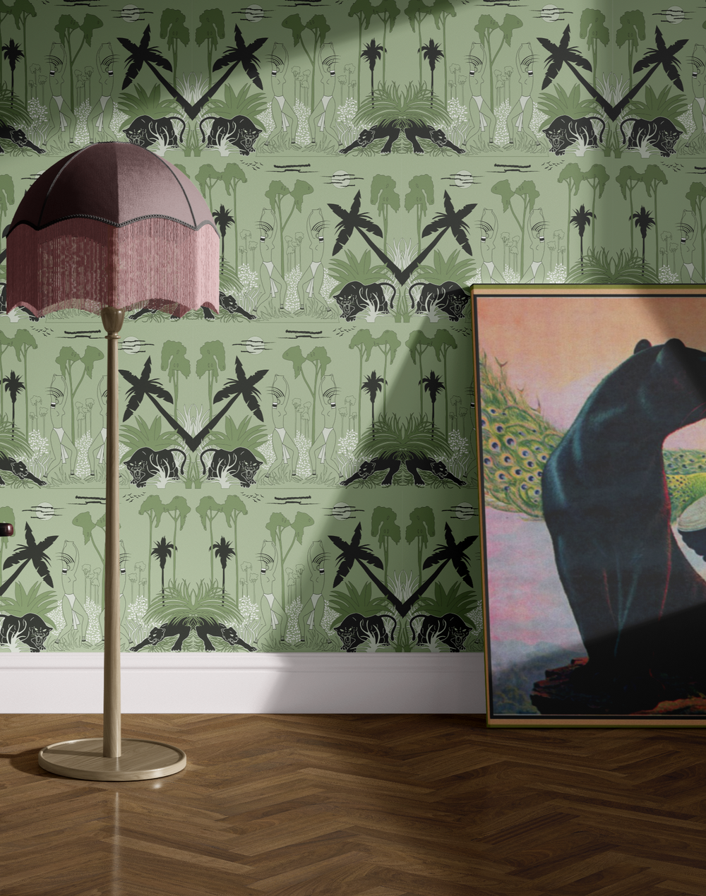 A Unique, Art Deco,  jungle themed creative wallpaper with striking black panthers