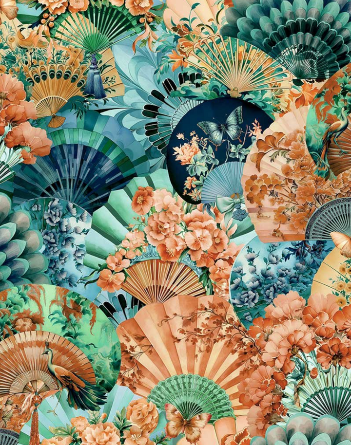 This maximalist wallpaper is filled with watercolor art deco fans that are filled with cherry blossom. It’s very beautiful and dreamy and will add a talking point to any space.