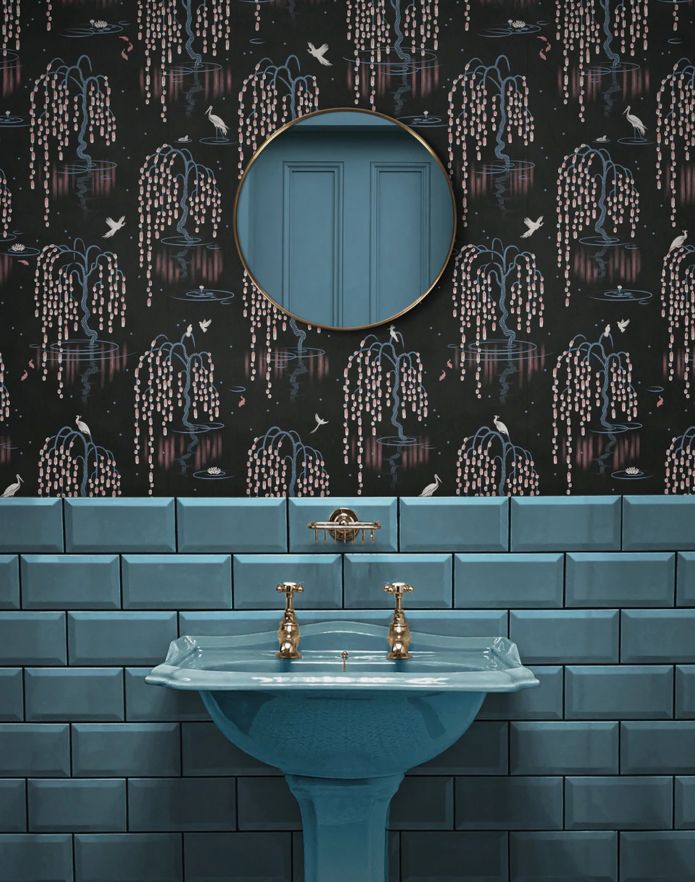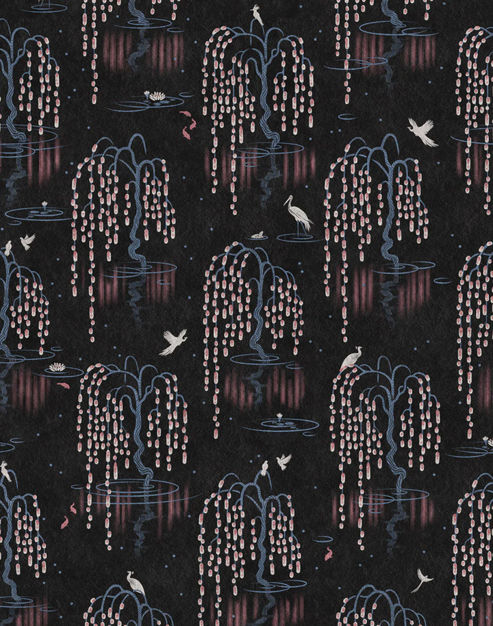 Black Cherry – a daringly dark base with accents of pink and blue, this works particularly well as a bedroom wallpaper.