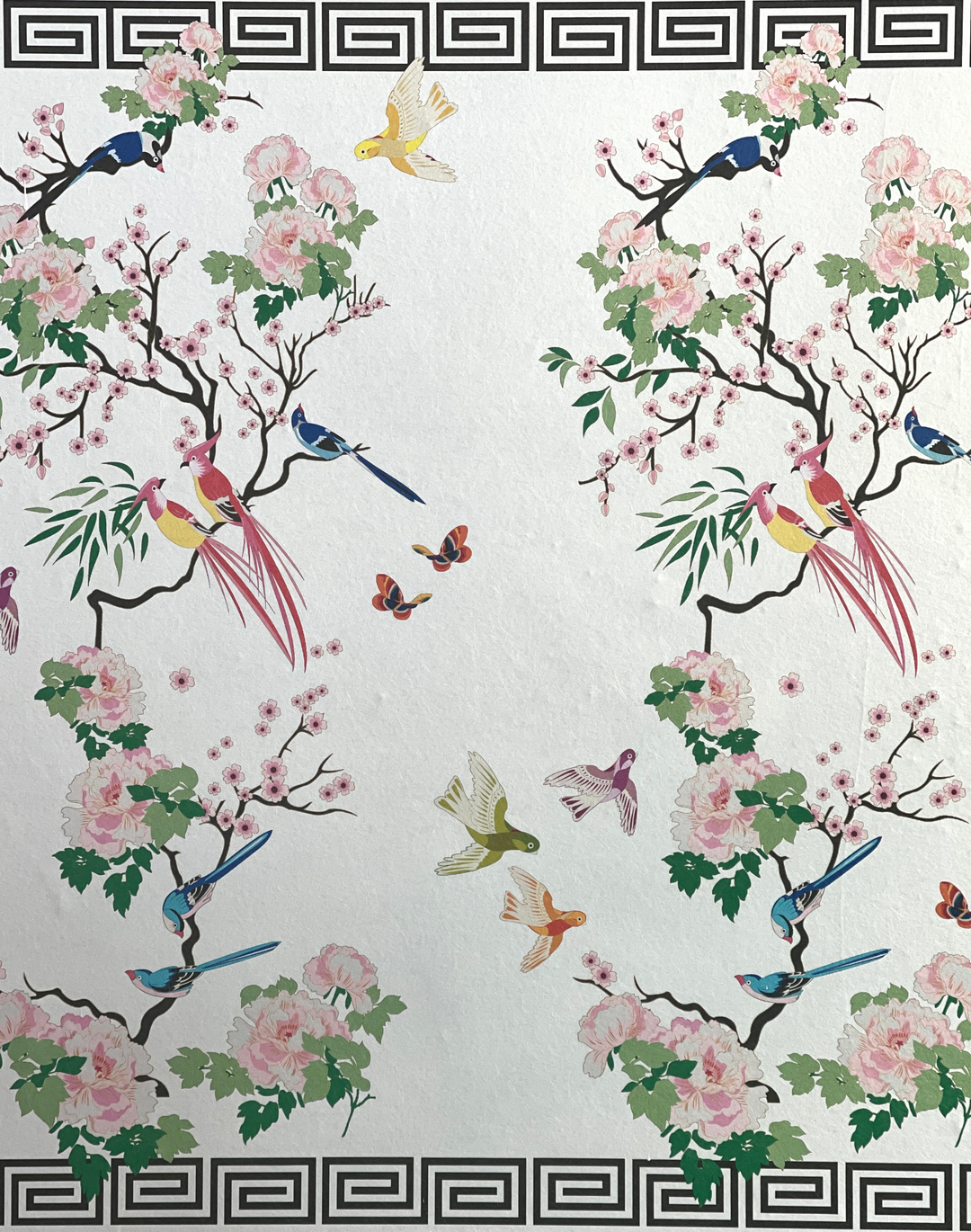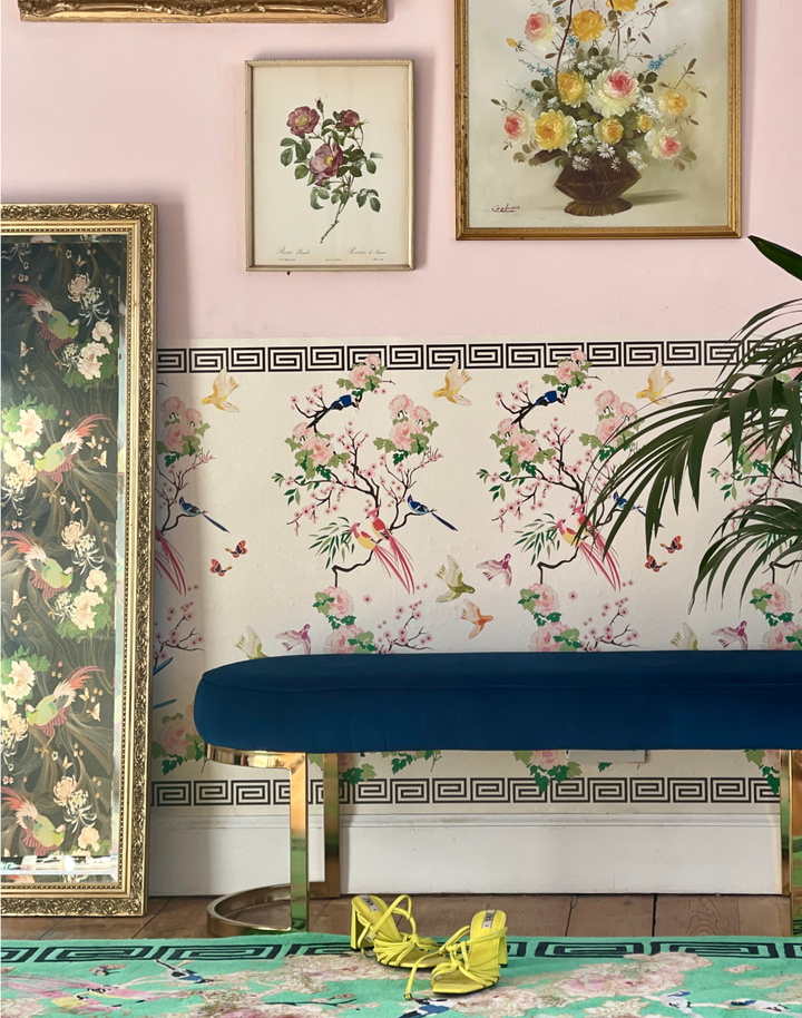 Inspired by the design of our gorgeous hand-tufted rug Nurture, this border-style wallpaper has nature and living in harmony at her heart. She shares a positive, uplifting message and brings luxurious glamour to homes. Surround yourself in nature as diverse, exotic birds exist side by side, surrounded by blowsy pink peony roses in full bloom and delicate plum blossom. The dramatic black backdrop allows every motif to stand out in glorious color, while a linear-patterned gold border grounds the scene to create a cocoon-like sanctuary.