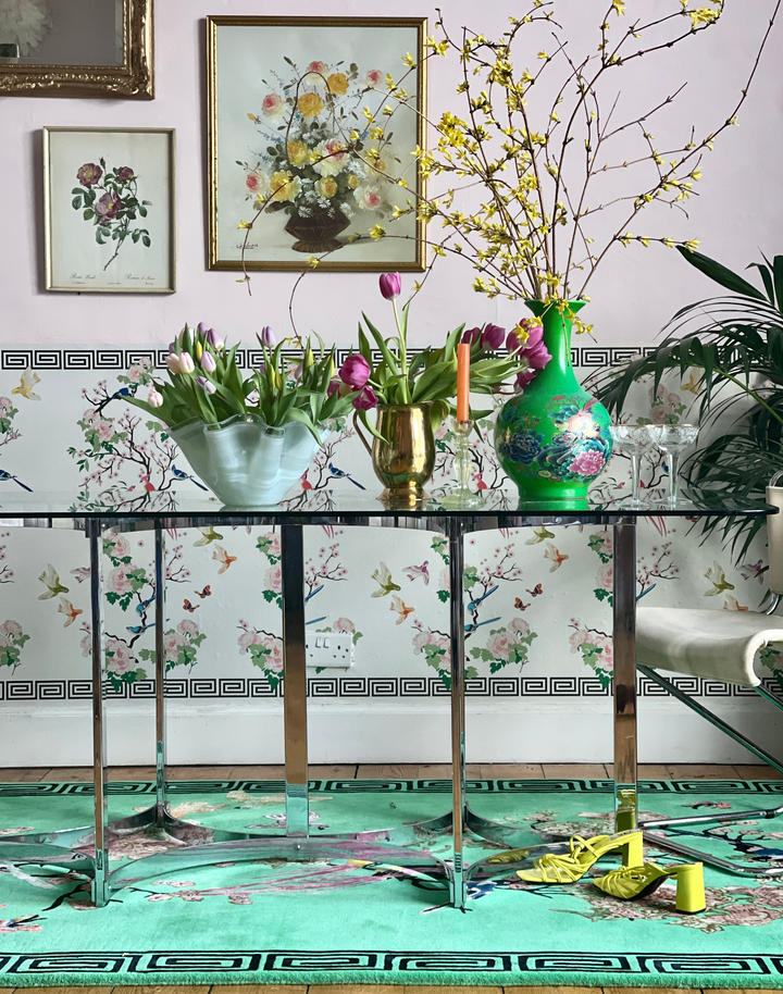 This border style offers an easy application of décor and instant glamour. The pinks, gold and black work as neutrals, which makes this an easy design to use in many homes. The perfect alternative to an entire wall of wallpaper.