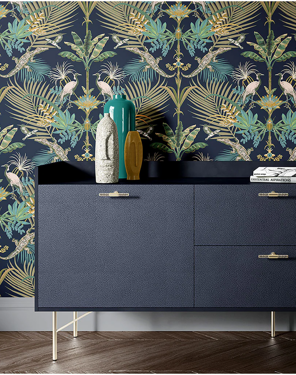 Truly a statement in an interior, this bold patterned wallpaper is rich and dramatic on the wall. Luxurious and opulent, the Crocodilia design is full of River Nile splendour with lush palms amongst DeMoiselle Cranes and fearsome Crocodiles. Details such as a bejewelled Crocodile eye and elegant composition make this an unforgettable design with a vibe of opulence for your home decor.