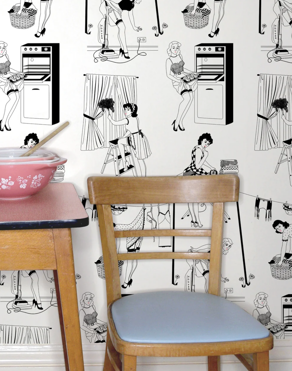 Dupenny's best-selling retro wallpaper is a take on mid-century Americana, featuring the classic 1950s housewife. This tongue-in-cheek 50s Housewives wallcovering is perfect if you're looking for kitchen or utility room ideas, or if you would like to inject some fun and personality into your home. Dupenny's classic black and white palette will compliment any color scheme.