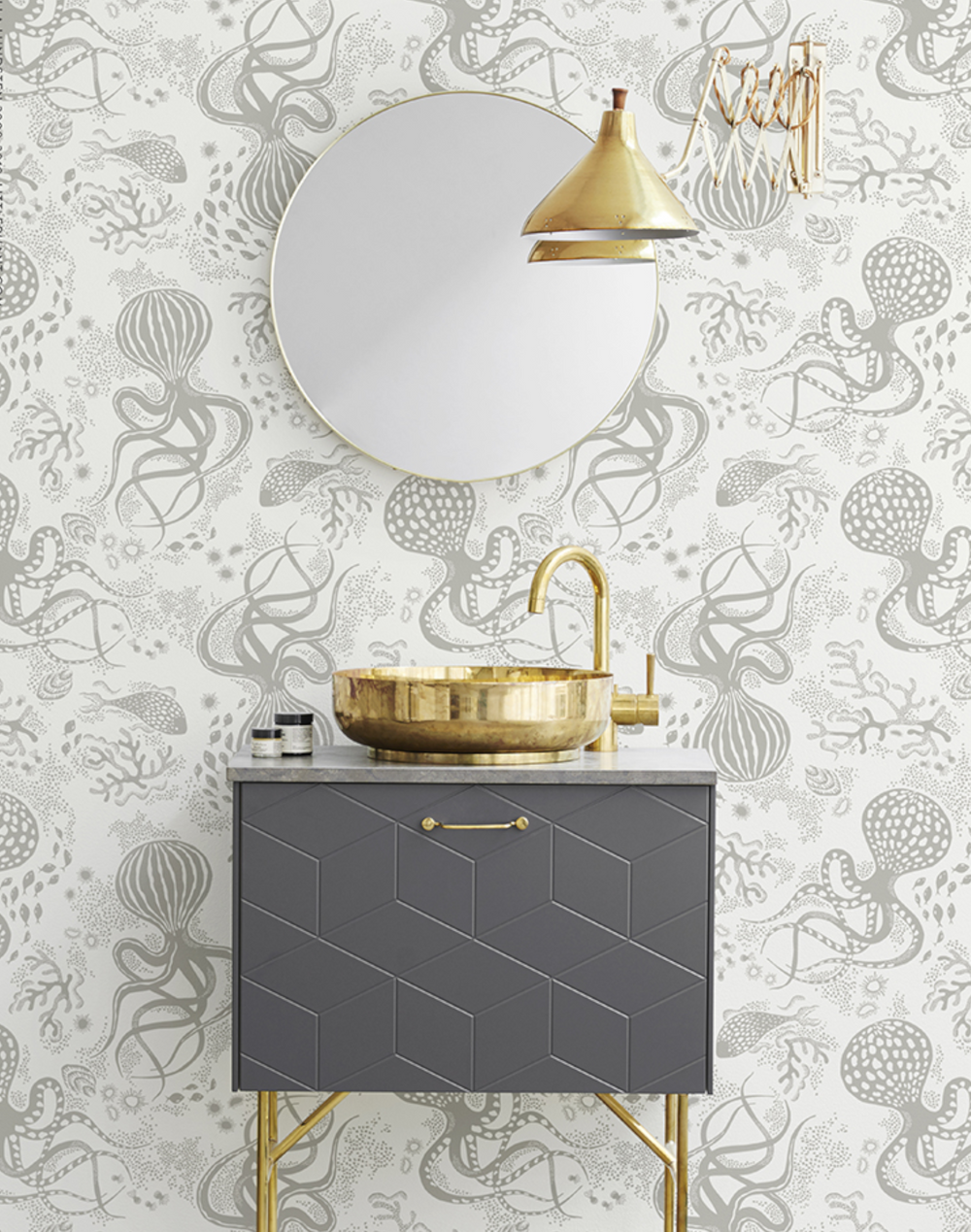 The inspiration for the wallpaper Aquatic comes from the salty waters of the Mediterranean with its white sand and the fantastic creatures that live there. The pattern takes you on a journey from the Amalfi Coast to the French Riviera and breathes both sea tones and stylish graphic rhythm.
