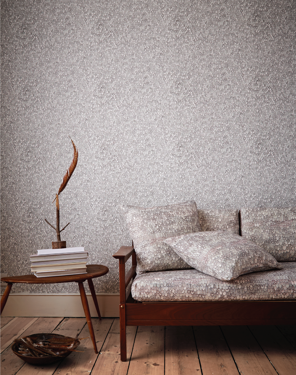 Each feather that makes up the ‘Bird’ design, has been hand drawn in pen. The paper is inspired by the many varied patterns in the feathers of both the male and female pheasant and is designed to create a textural yet graphic effect on the wall.