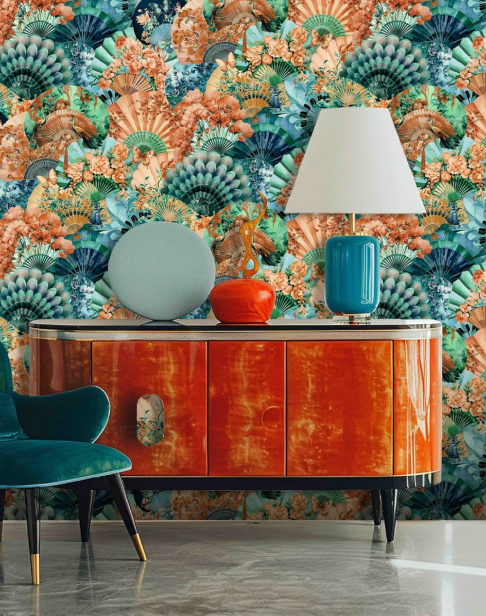 This maximalist wallpaper is filled with watercolor art deco fans that are filled with cherry blossom. It’s very beautiful and dreamy and will add a talking point to any space.