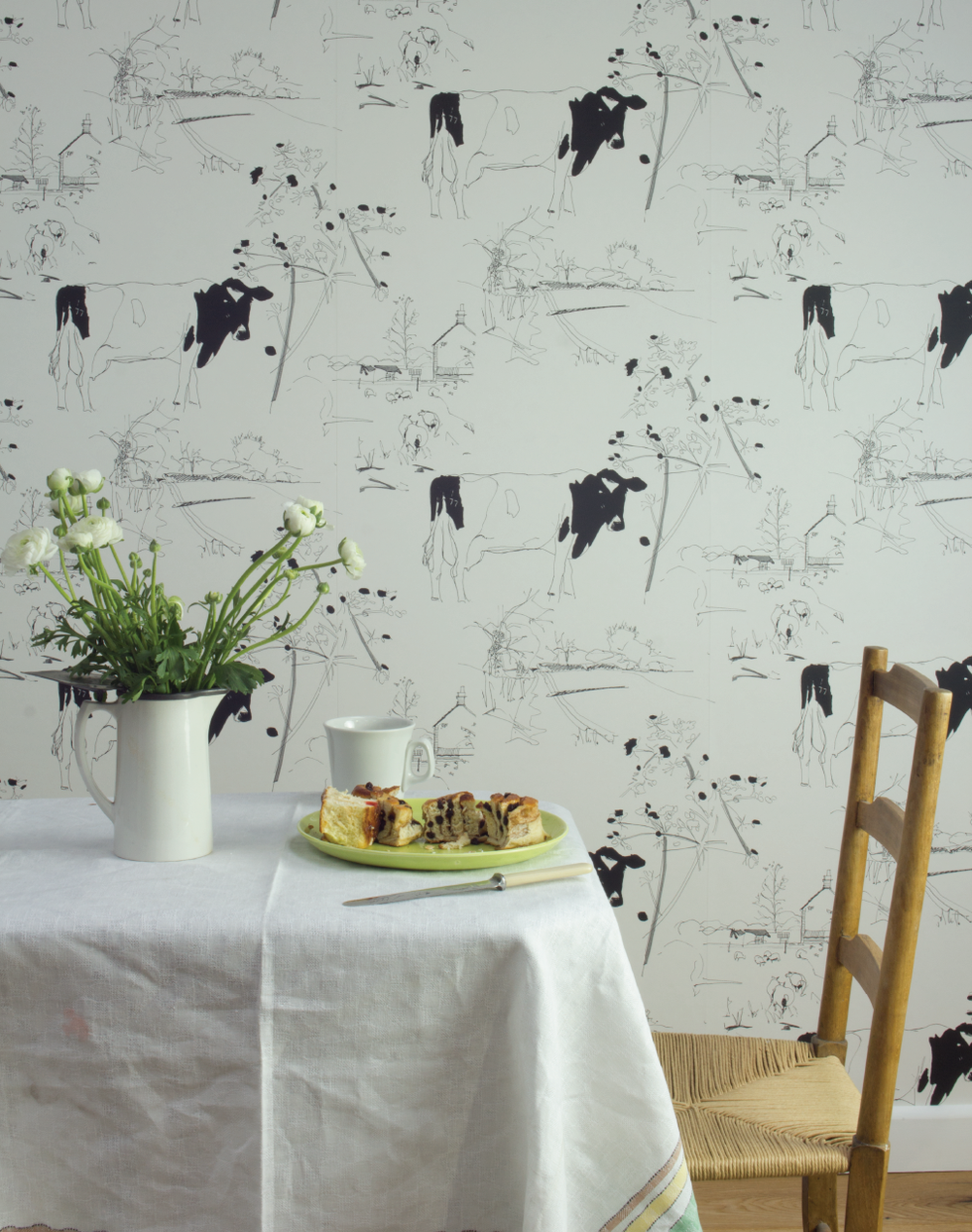 “Countryside Toile is an example of a design which emerged directly from observation.  I took a short bike ride one lunchtime from the factory and found myself in a field of cows, with sketch book and camera to hand I recall a moment of summer; away from the noise of the printing factory, with the sun warming my head as I sat down on the dry grass and drew the cows.