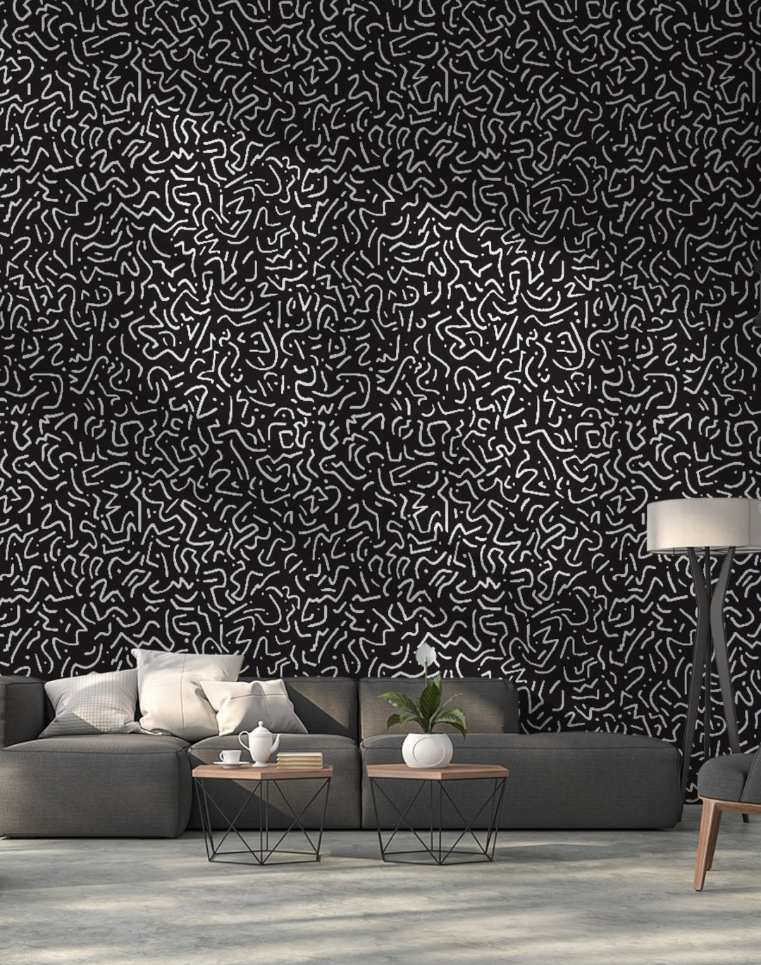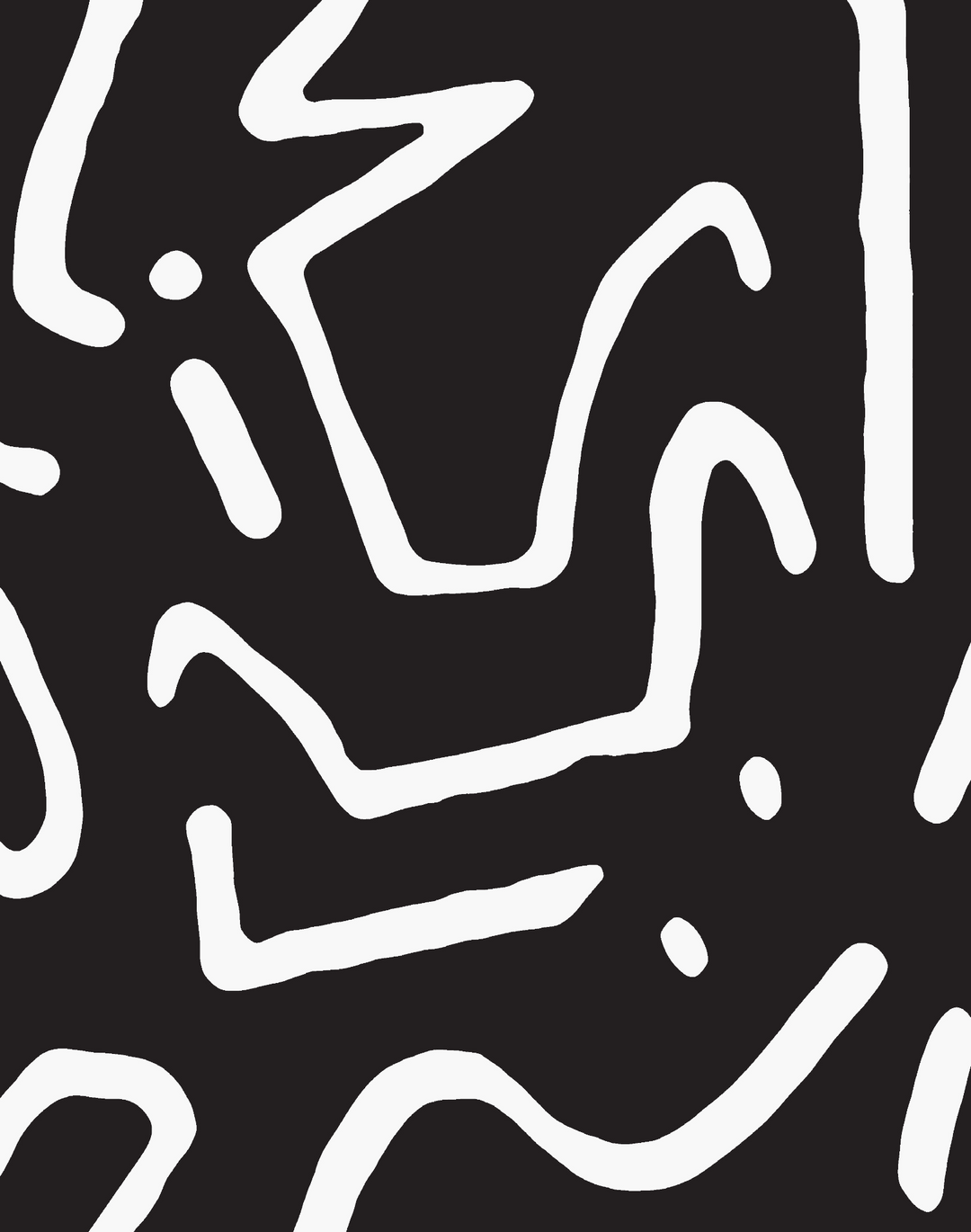 Merenda created this pattern from a drawing by her partner, Max Kahan. The energetic pen strokes hint at Keith Haring’s art from the ‘80s and make the eye dance throughout the pattern’s negative space. Each of the 10 colorways are named after dance moves from the ‘80s.