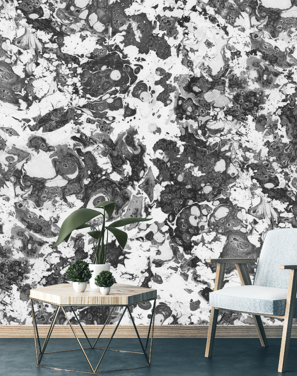 Marbre was created with a paper marbling technique and a lot of experimentation in Merenda’s home in Queens, NY. Its large repeat and scale elevates any space while its rich color options and textures make a dramatic mark.