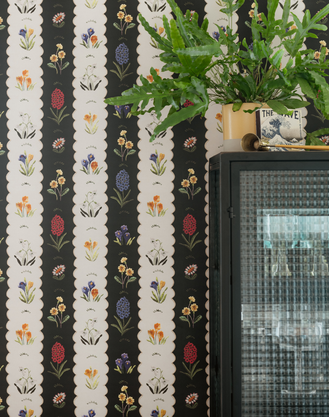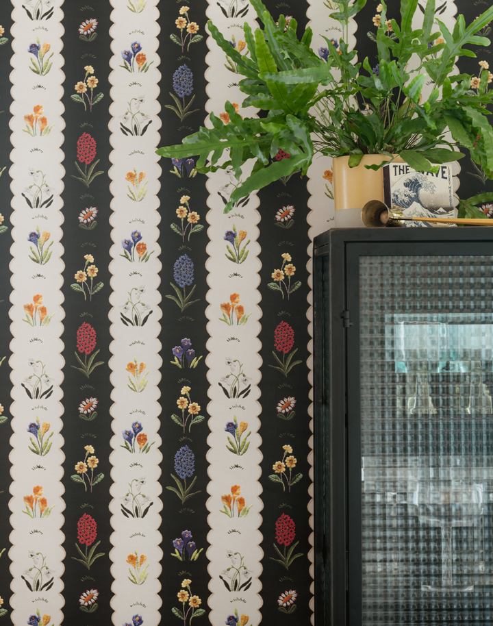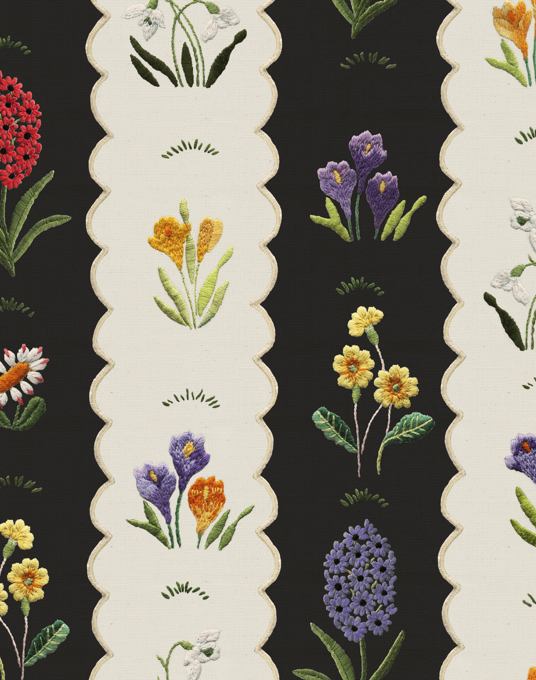 Our floral stripe, originating from a beautiful embroidered tablecloth that was used during our Easter lunch that I couldn’t stop staring at. Upon learning it was hand embroidered by my husband’s Great-Great Grandma Mavis, who meticulously completed each intricate flower by hand, I was compelled to turn it into a wallpaper for everyone to enjoy. It was kindly lent to me and I reworked the elements to create this scalloped stripe. We aimed to keep the 3D nature of the embroidery and all of the beautiful original details. The design has been lovingly named after Grandma Mavis. Our Alabaster and onyx colorway aims to mimic traditional black and white stripes but with a twist!