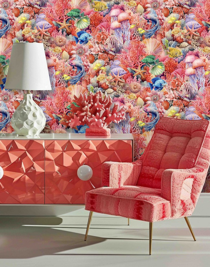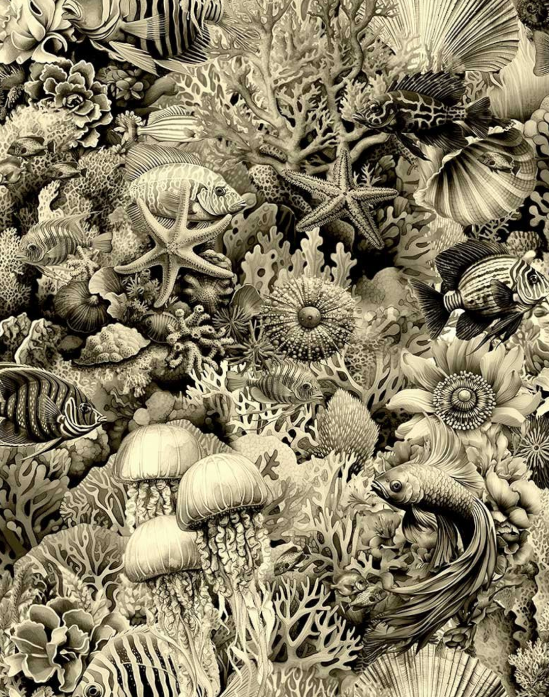 This maximalist wallpaper captures the awe-inspiring beauty of the ocean, featuring a vibrant array of coral, tropical fish, shells, and shimmering jewels. The wallpaper itself is full of intricate details and vibrant colors that bring the underwater world to life. Hot, bright pops of color contrast against the darker backdrop. Versatile for both contemporary and traditional settings.