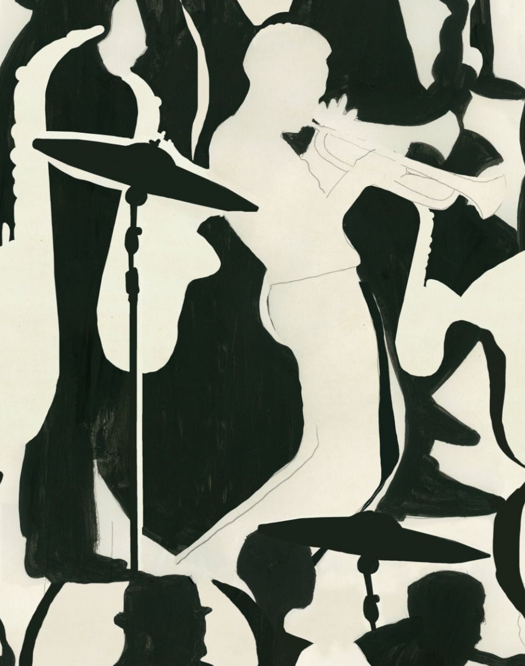 Playing with the illusion of negative space, TRIPPING displays silhouettes of both musicians and instruments, resulting in a stylish, monochromatic print. Merging contrasting colors with multiple illustrations, this design radiates the energy of the jazz club where bodies move together as one to the music, enveloped in the escapism that it offers away from the world outside.