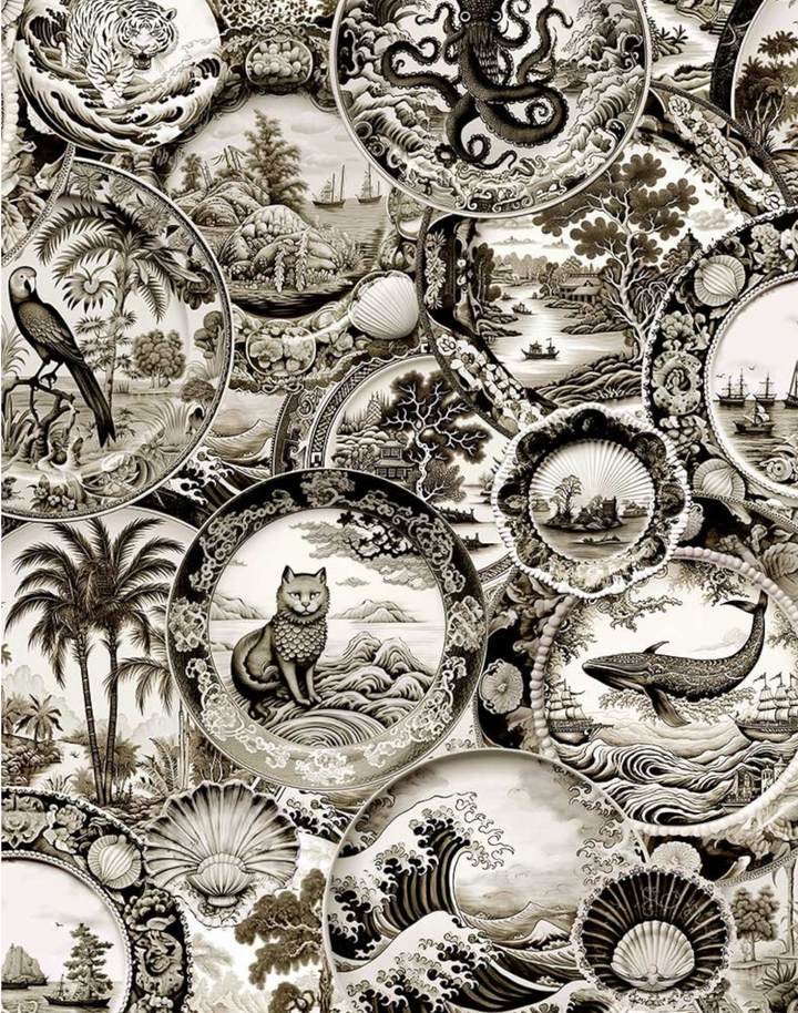This maximalist wallpaper features whimsical pastel plates featuring delicate swans, carousel horses, graceful hummingbirds, dainty bows, and bejeweled ladybirds. Transform your space into a maximalist heaven and set the scene for a super fun interior!