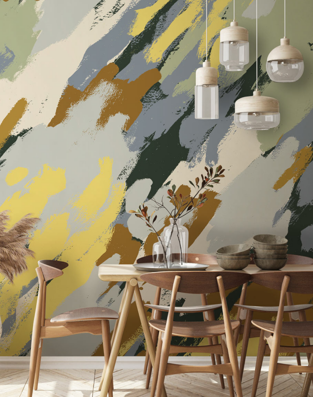 "Dendrophile II" is inspired by luxurious foliage of trees. Featuring a range of leafy green and ocher-grey hues, it furnishes any space with the lush embrace of the forest.
