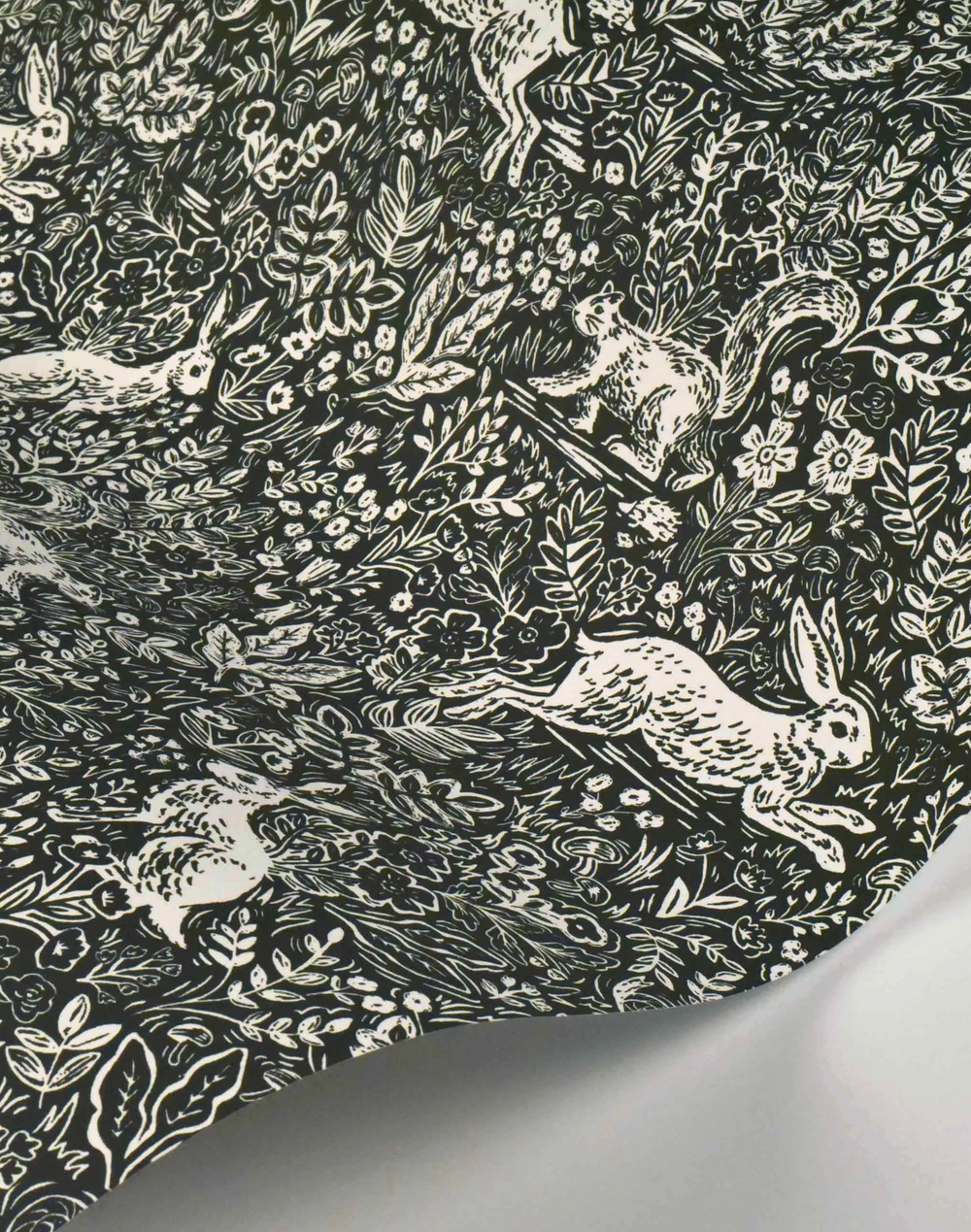 Our Fable print is inspired by classic tales, and features illustrated wood-block inspired woodland creatures among a forest of leaves and flowers. This wallpaper is screen printed and comes in 27 inch rolls with a 25.25 inch repeat.