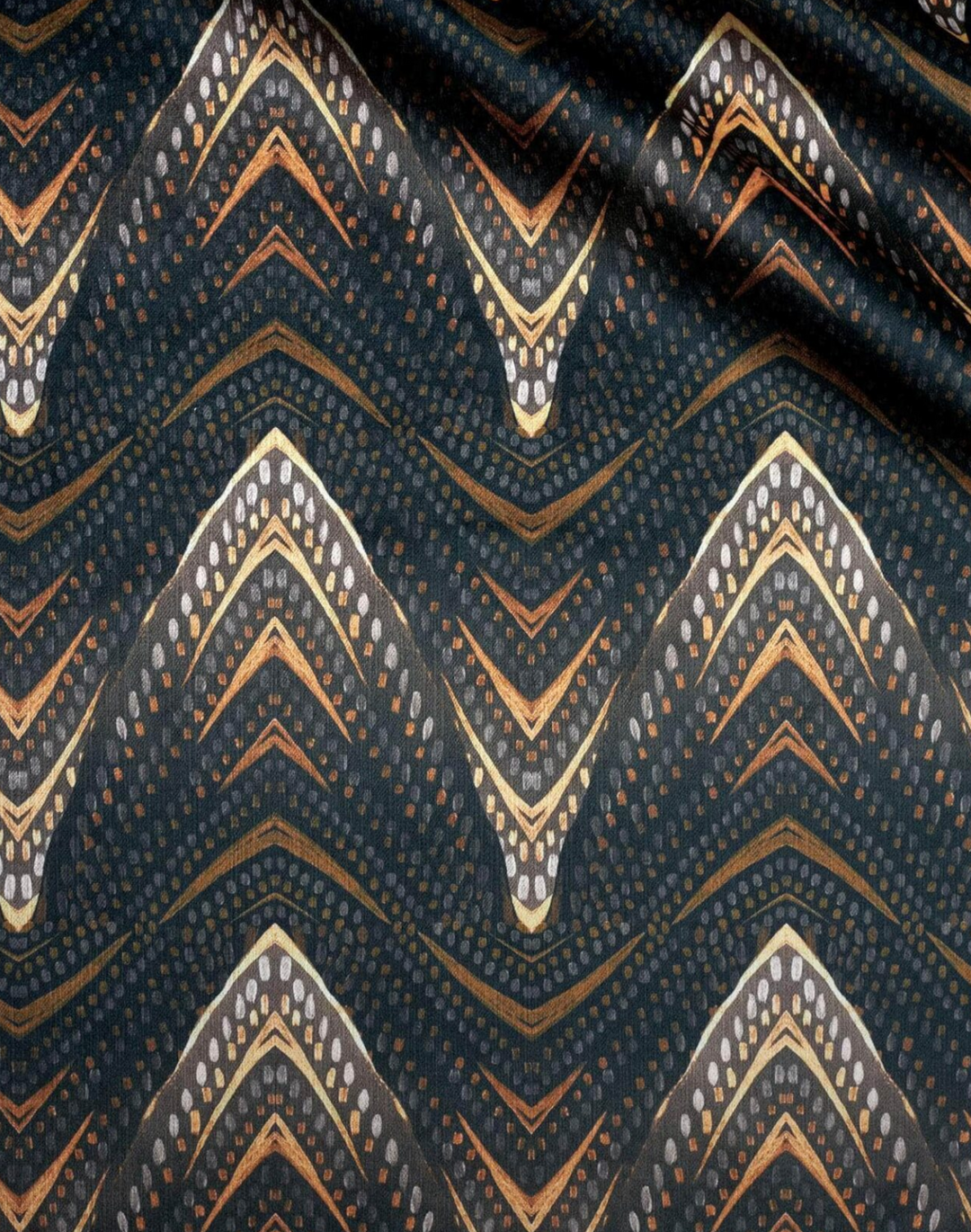 Perdita – a 1920s inspired design created from painting metallics onto black canvas. The depth has printed soft, so the background is more of a bitter chocolate/soft black color, with grey gold and toffee accents.