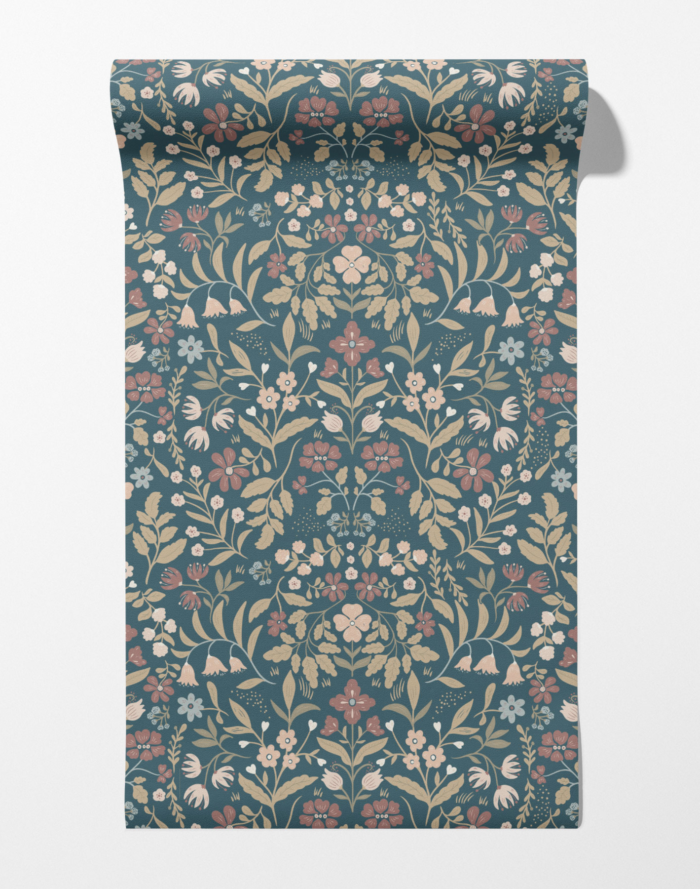 The Roselyn design holds a steady rhythm—structured, detailed, and deliberate. The mirrored floral layout has a way of grounding a room without overwhelming it. It’s thoughtful, balanced, and carries a lived-in kind of richness. BM Boothbay Blue carries this slightly teal base. Blush and ivory flowers soften it without losing presence.
