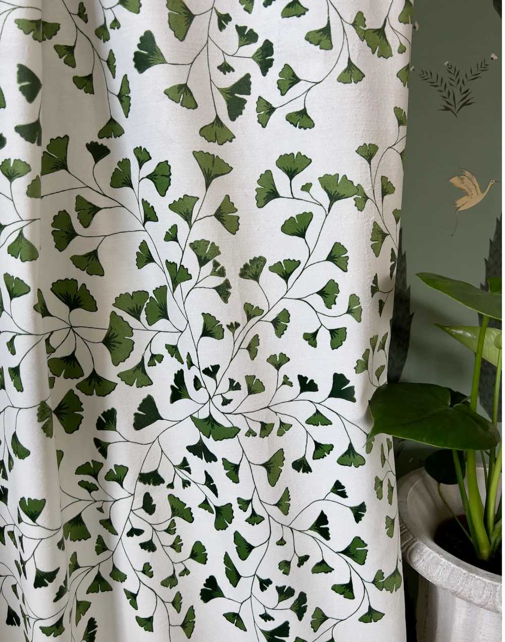 Gingko Leaves is an illustrative design portraying decorative fan shaped gingko leaves and the movement of the vines draw the eyes in this lustrous fabric suitable for drapery and upholstery. Available in 4 color ways.