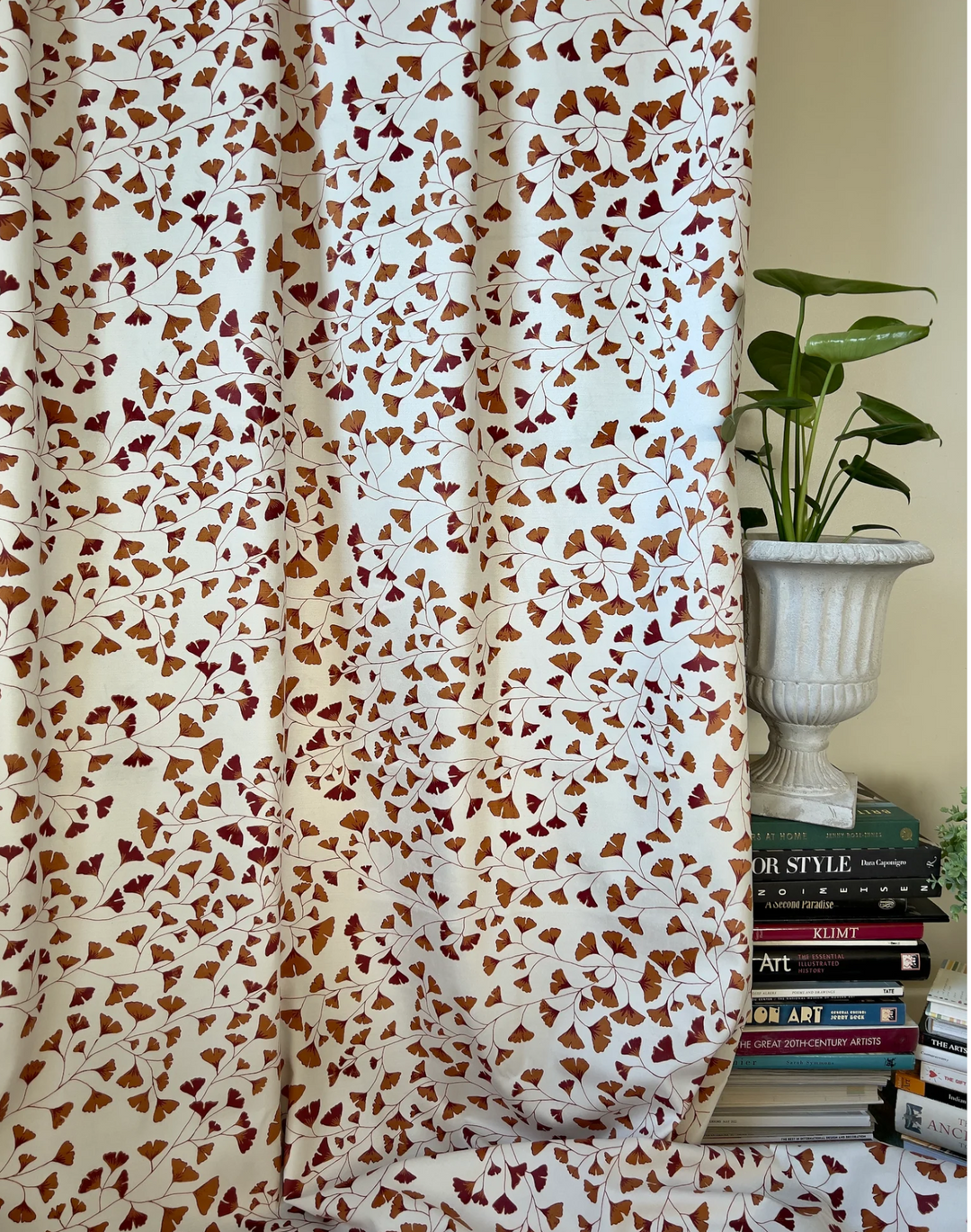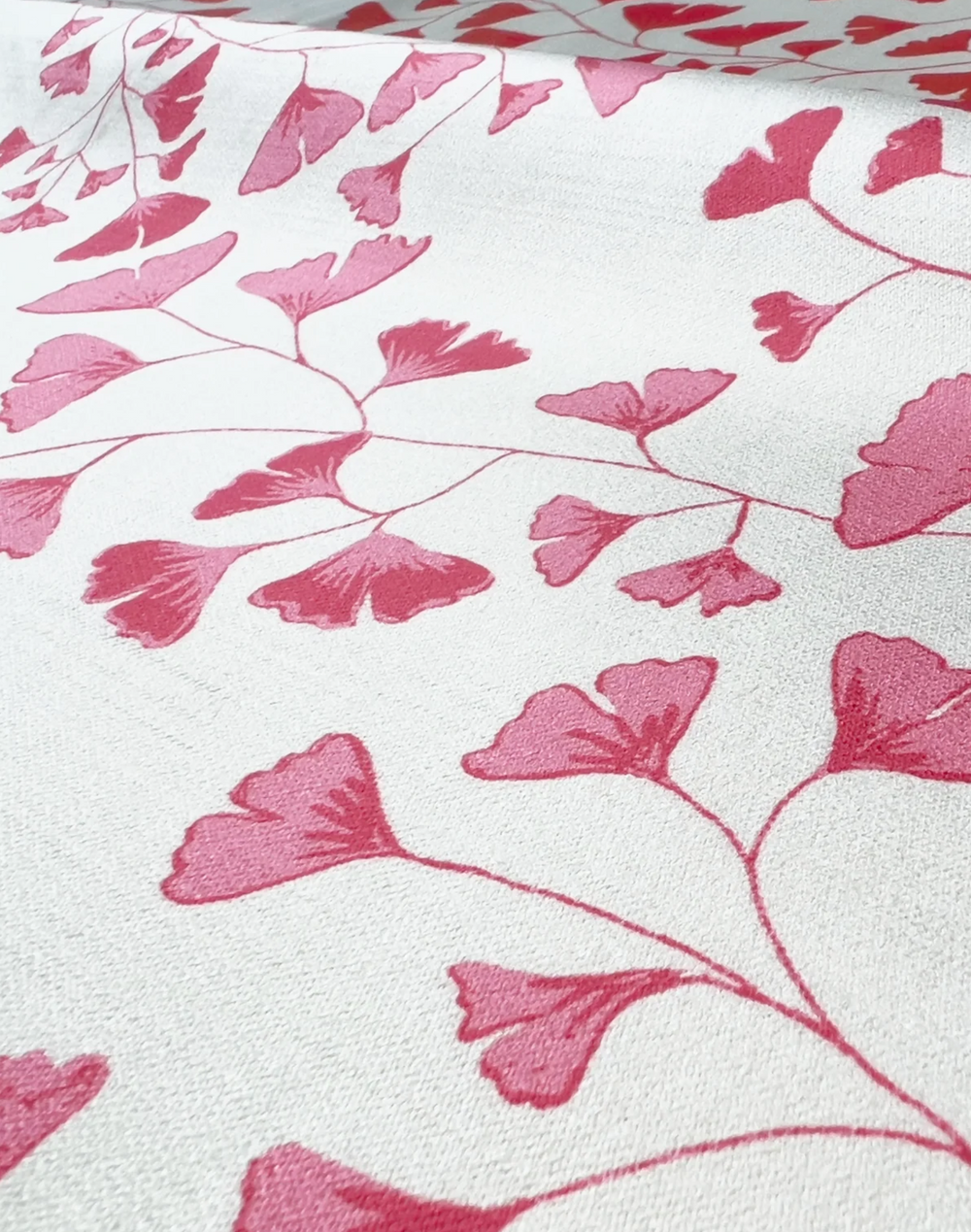 Gingko Leaves is an illustrative design portraying decorative fan shaped gingko leaves and the movement of the vines draw the eyes in this lustrous fabric suitable for drapery and upholstery. Available in 4 color ways.