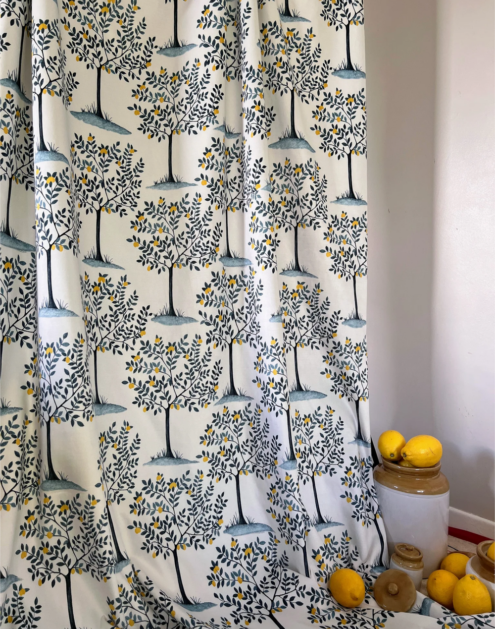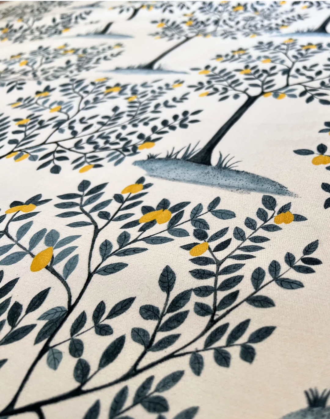 Lemon grove fabric is an illustrative design depicting Lemon tress, hand painted by Shweta’s signature style inspired by Indian miniature painting techniques using pigments and meticulous brush work. Lemon Grove fabric brings freshness in a space with an eclectic zest.